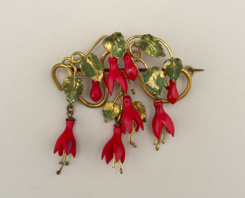 This is a brooch. It is dated 1865–70 and we acquired it in 1927. Its medium is gold, red stained ivory, enamel. It is a part of the Product Design and Decorative Arts department.