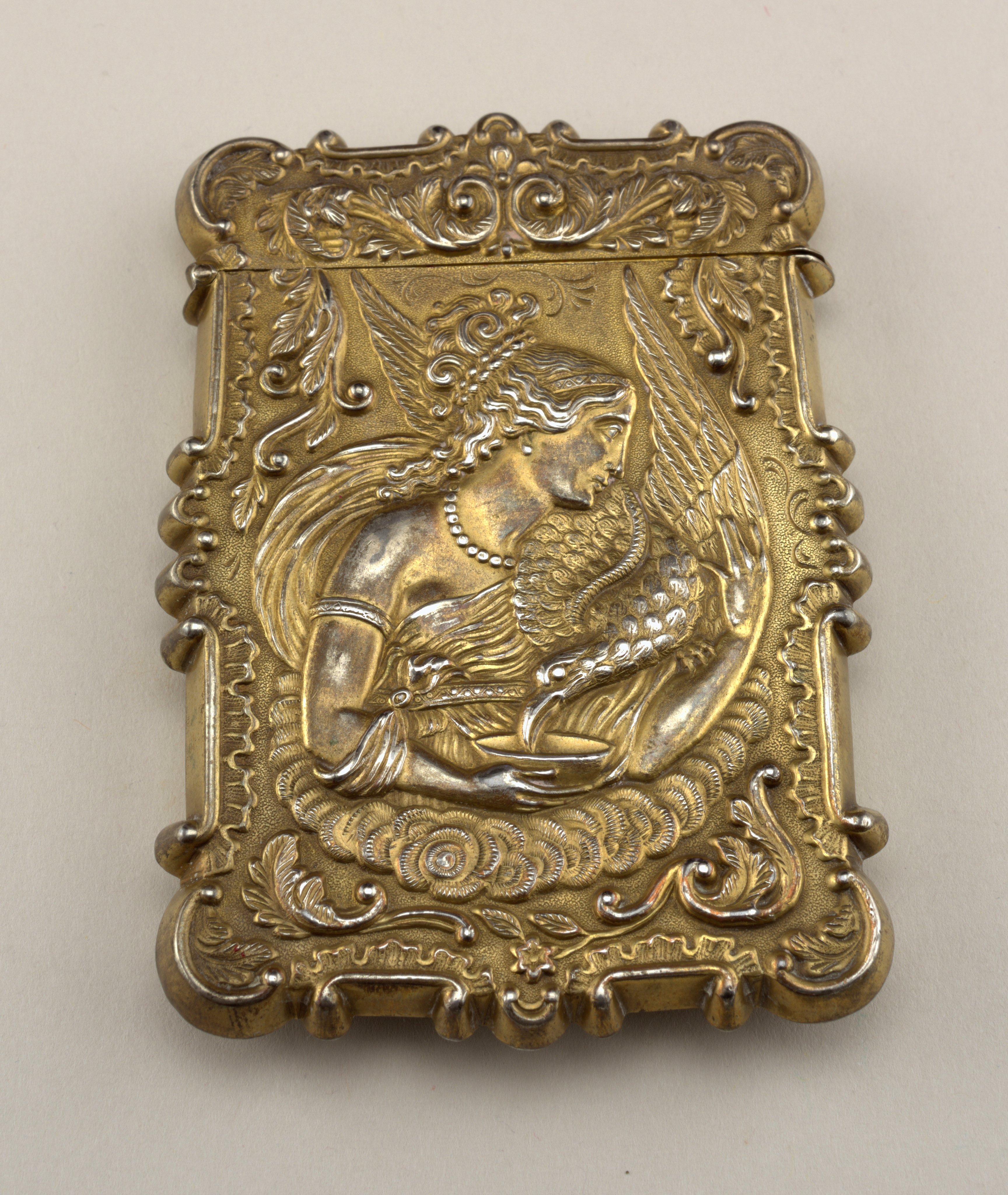 This is a Card case. It is dated mid-19th century and we acquired it in 1927. Its medium is brass, silver wash. It is a part of the Product Design and Decorative Arts department.