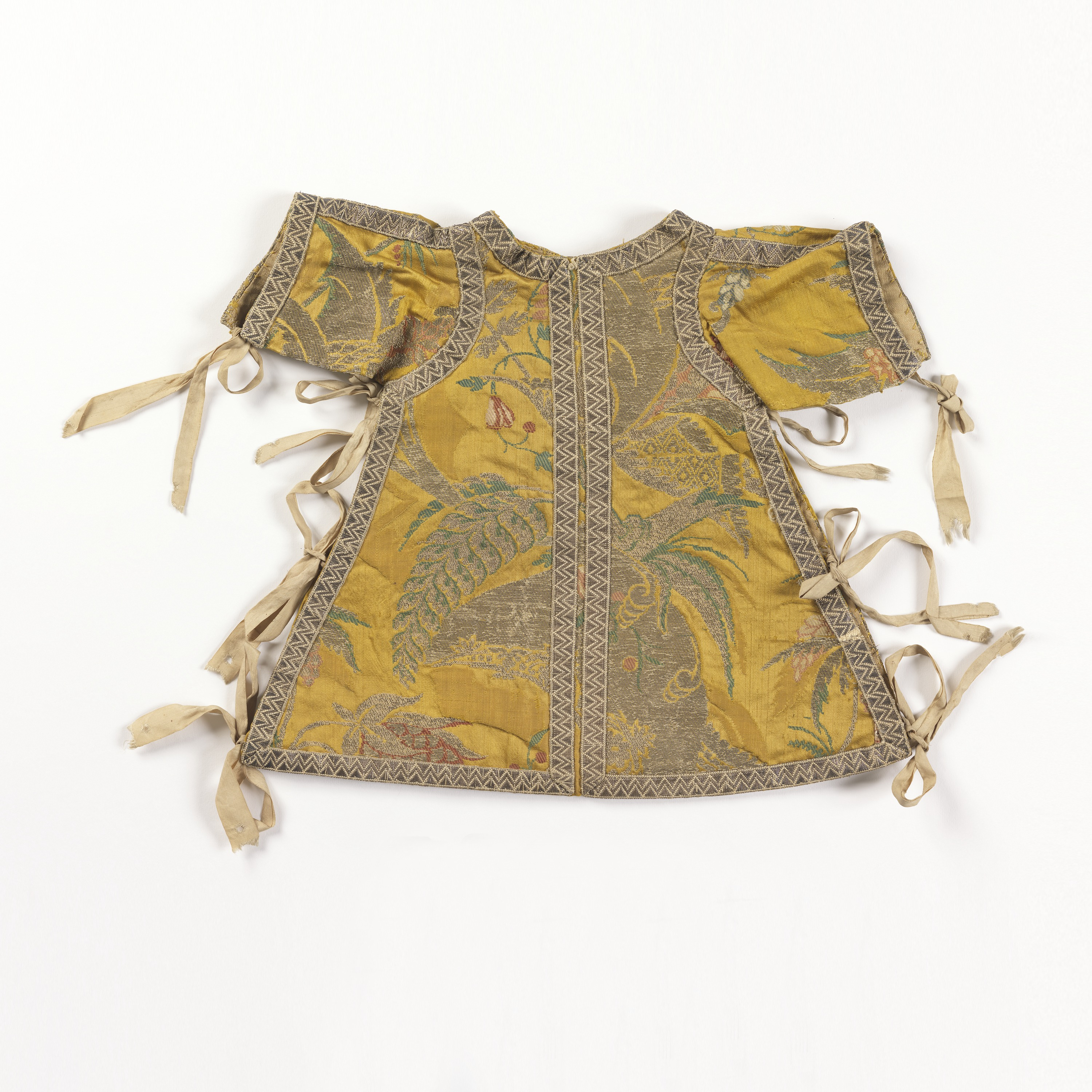 This is a Garment for religious statue. It is dated 18th century and we acquired it in 1927. Its medium is silk, metallic yarns and its technique is satin weave with discontinuous supplementary weft patterning (brocade). It is a part of the Textiles department.