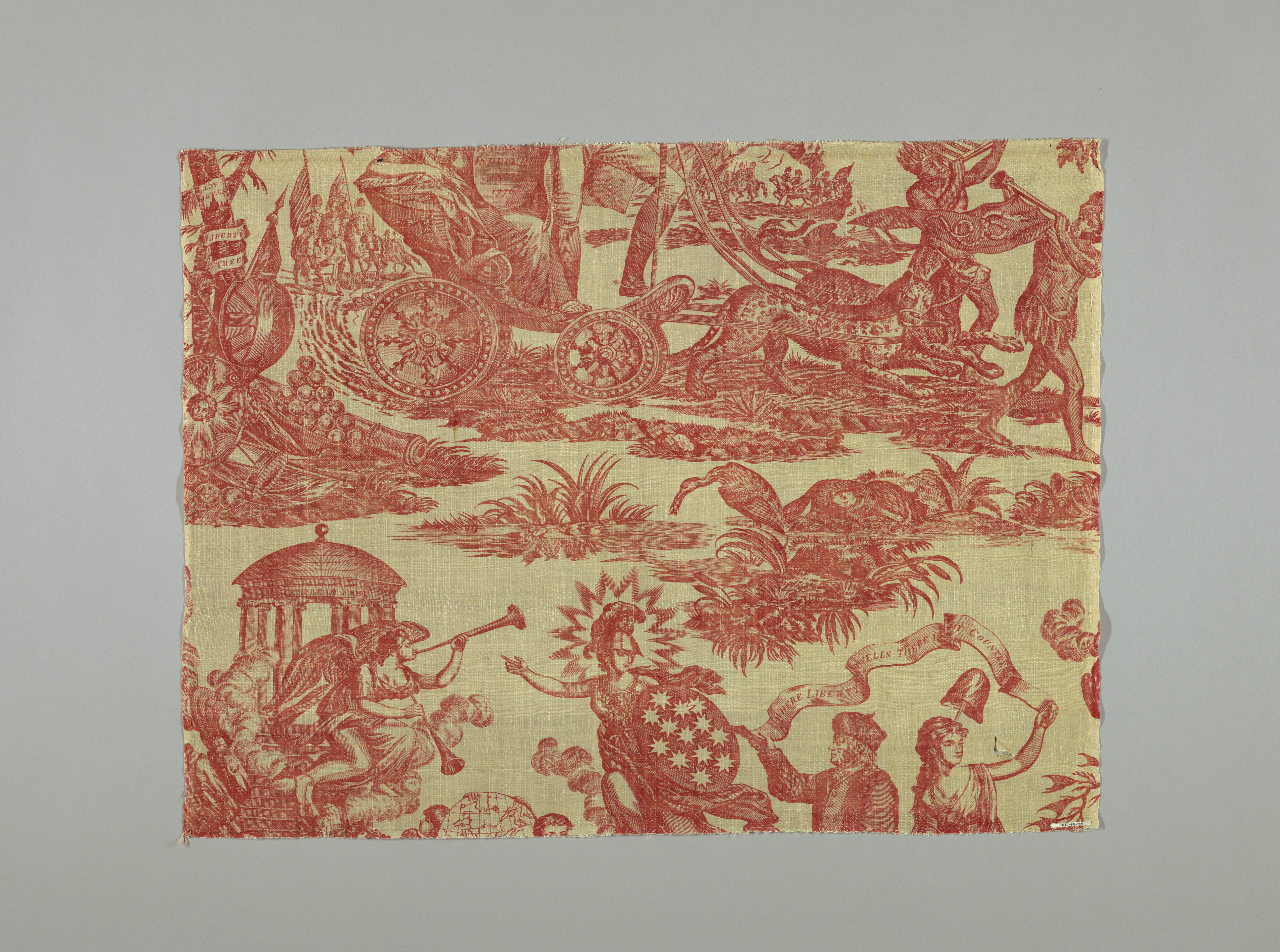 This is a Textile. It is dated 1780s and we acquired it in 1931. Its medium is linen warp, cotton weft and its technique is copperplate printed on plain weave. It is a part of the Textiles department.