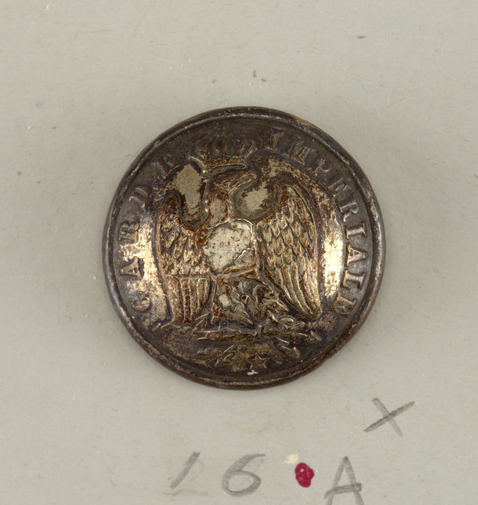 This is a buttons. It is dated 1852–70 and we acquired it in 1931. Its medium is brass, pewter and silver foil. It is a part of the Product Design and Decorative Arts department.