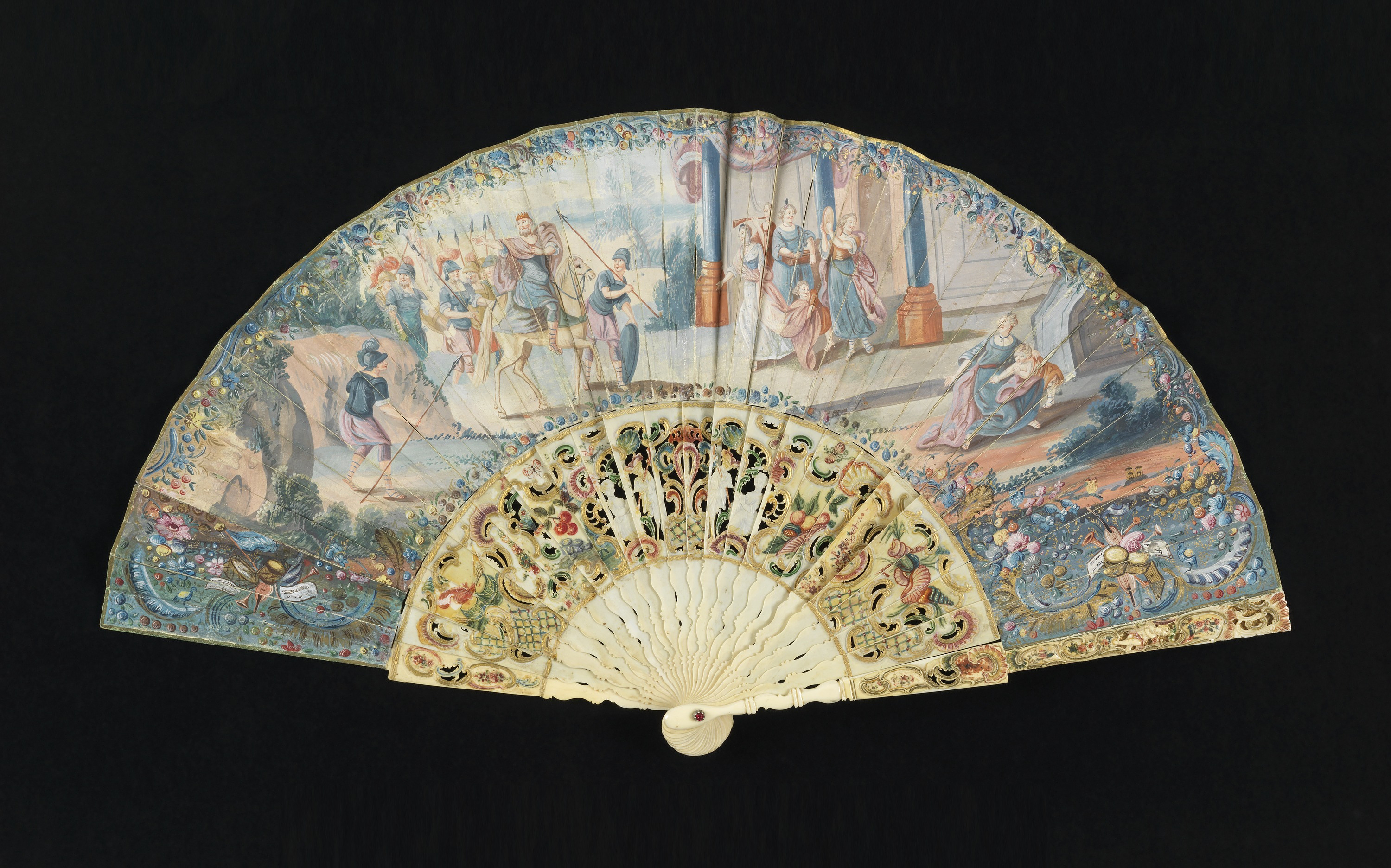 This is a Pleated fan. It is dated mid- 18th century and we acquired it in 1931. Its medium is skin leaf painted with gouache; carved, gilded and painted sticks. It is a part of the Textiles department.