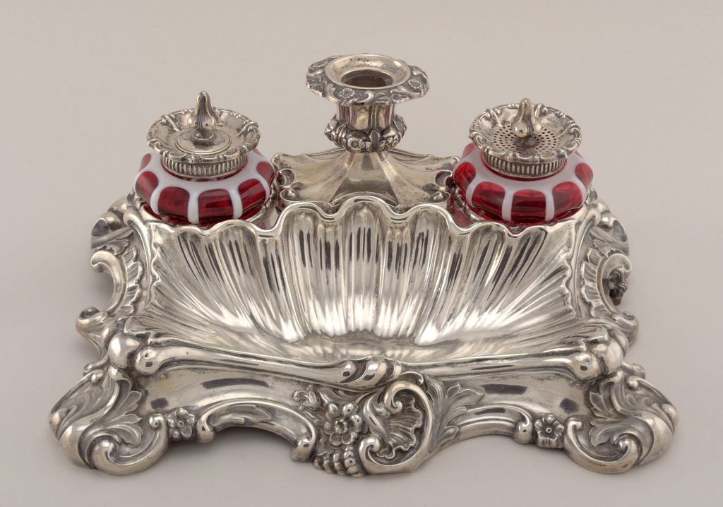 This is a Inkstand. It is dated ca. 1855 and we acquired it in 1931. Its medium is silver, glass. It is a part of the Product Design and Decorative Arts department.