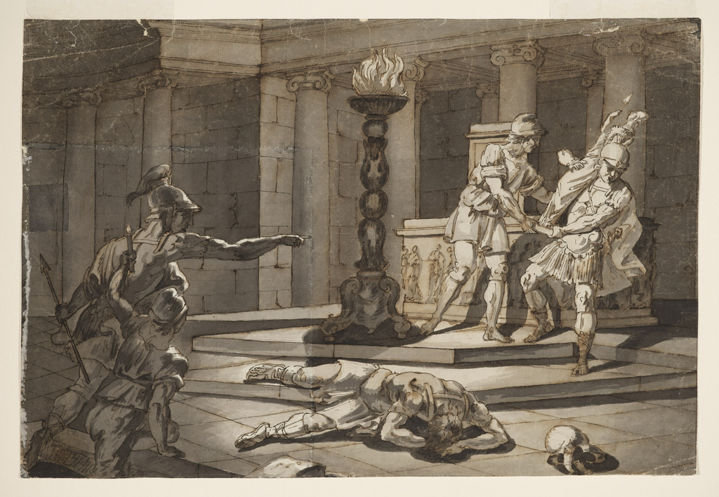 Drawing, Scene of Roman Soldiers; Italy; pen and brownish-black ink, brush and gray wash on cream paper; 31.6 x 46.2 cm (12 7/16 x 18 3/16 in.); Gift of Eleanor and Sarah Hewitt; 1931-64-289