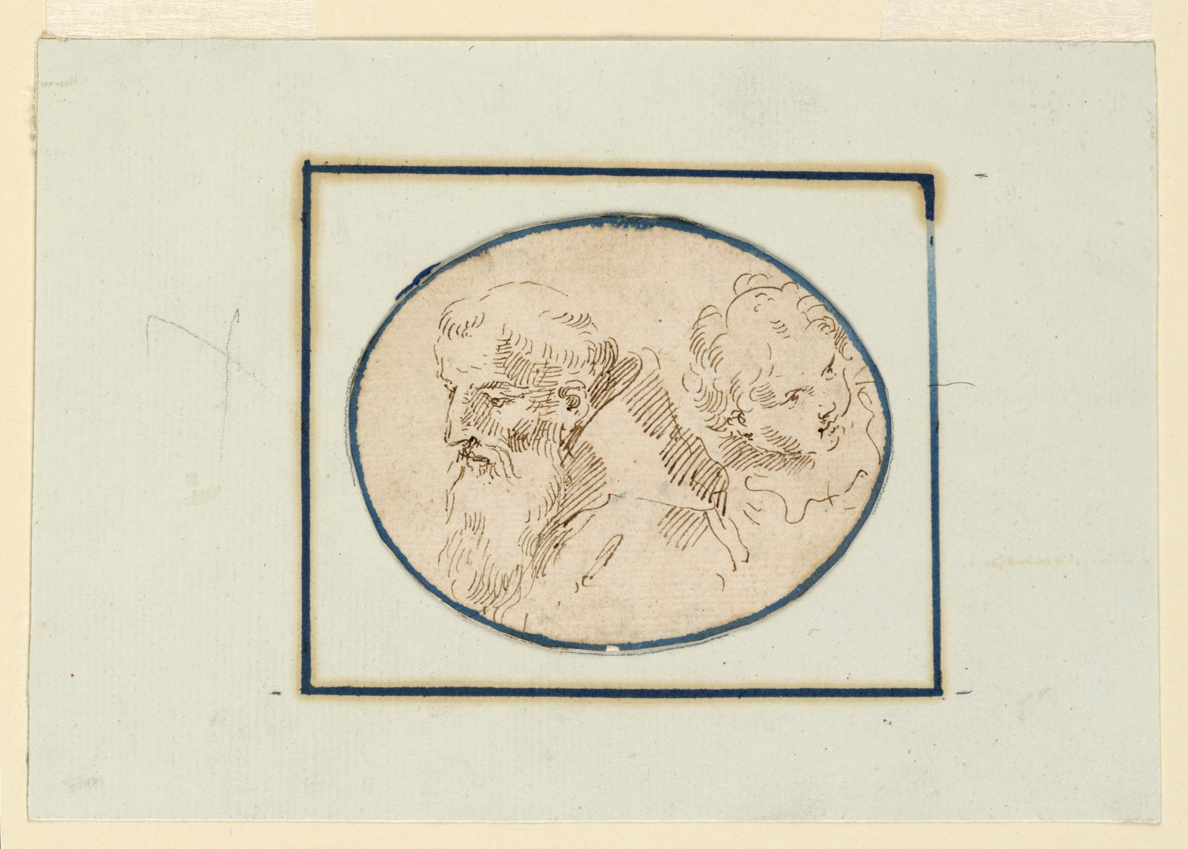 Drawing, The Head of an Old Monk and the Head of a Child; Donato Creti (Italian, 1671–1749); Italy; pen and ink on paper, mounted; 8.9 × 7.2 cm (3 1/2 × 2 13/16 in.); Gift of Eleanor Garnier Hewitt; 1931-65-17
