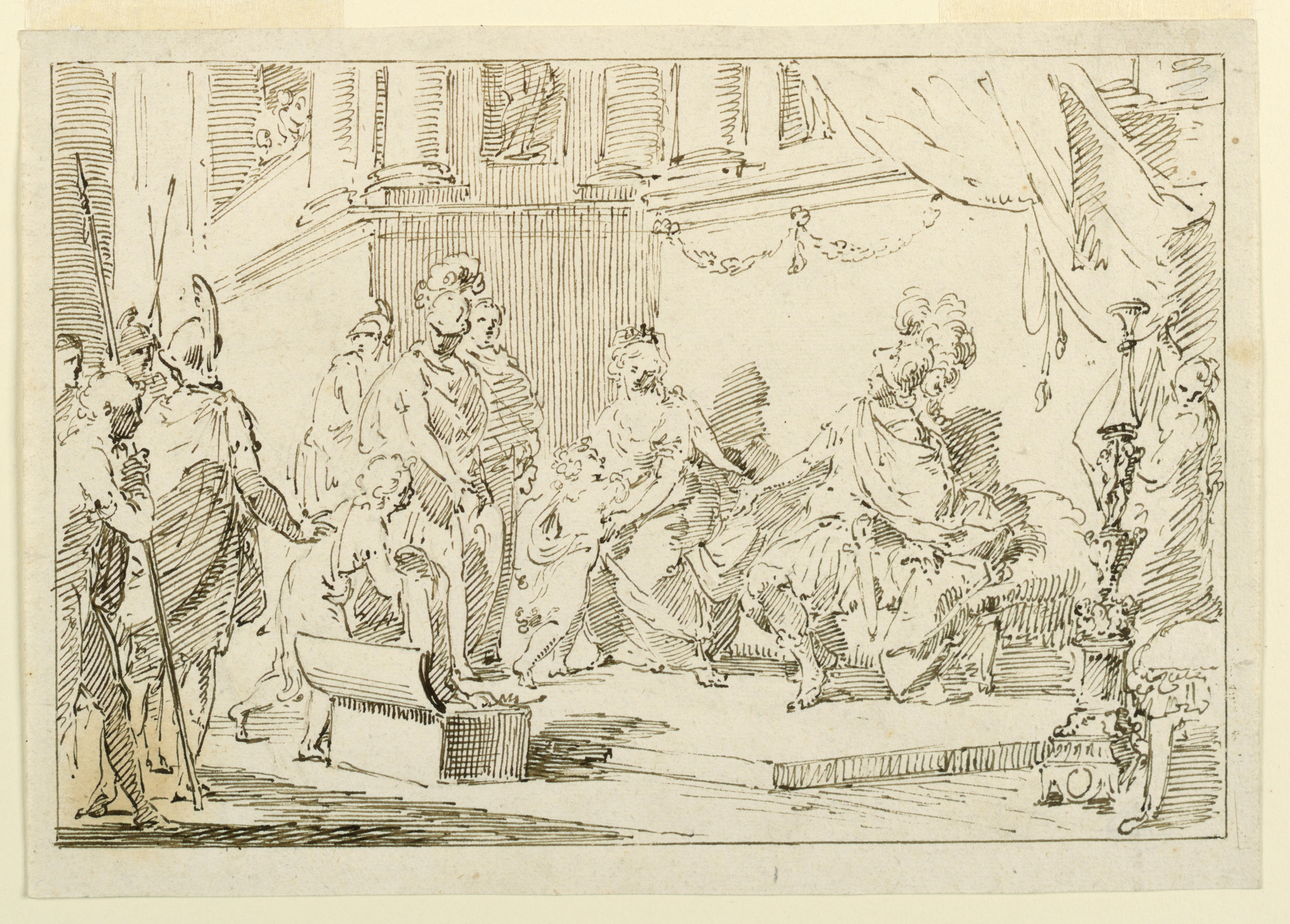 Drawing, An Audience Scene; Pietro Antonio Novelli (Italian, 1728 - 1804); Italy; pen and brown ink on laid paper; 19.4 × 27.4 cm (7 5/8 × 10 13/16 in.); Gift of Eleanor Garnier Hewitt; 1931-65-36