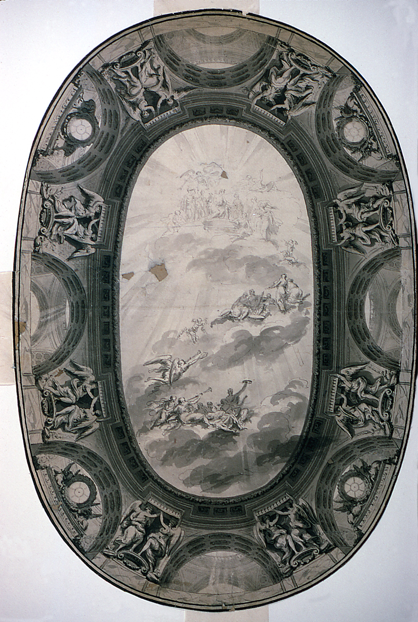 Drawing, Project for the Painted Decoration of the Ceiling of a Hall (Painted Oval Ceiling); Jean Baptiste-Marie Pierre (French, 1714 – 1789); France; pen and black ink, brush and gray and black wash on two sheets of off-white heavy laid paper joined together horizonatally, lined; 41.3 x 61.6 cm (16 1/4 x 24 1/4 in.); Gift of Eleanor and Sarah Hewitt from the collection of Mrs. Abram S. Hewitt; 1931-70-37