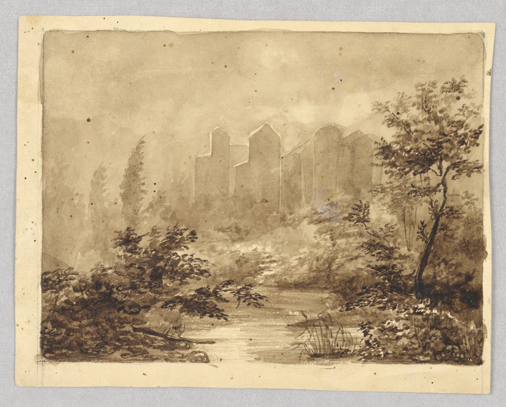 Drawing, Landscape; Charles Nicolas Ransonnette (French, 1793 - 1877); France; brush and bistre wash on tan paper; 14.2 × 18.4 cm (5 9/16 × 7 1/4 in.); Gift of Eleanor and Sarah Hewitt; 1931-71-84