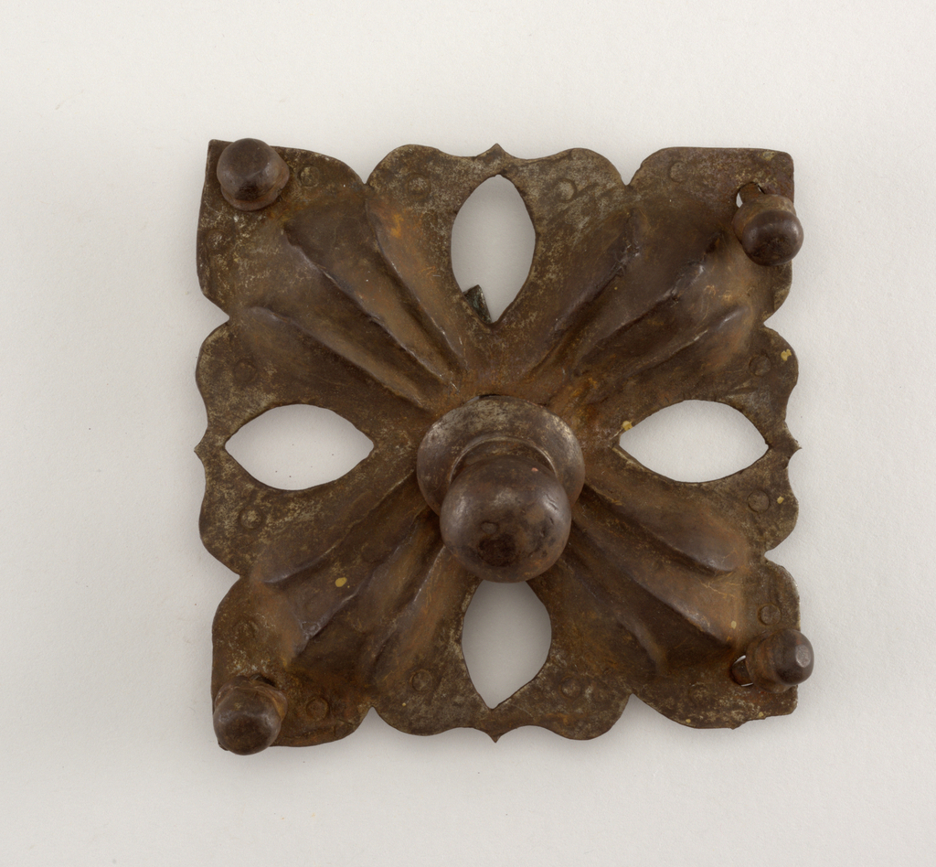 Decorative Door Boss And Nail; wrought iron; L x W x D: 1.6 × 13.3 × 13 cm (5/8 × 5 1/4 × 5 1/8 in.) H x diam.: 4 × 1.5 cm (1 9/16 × 9/16 in.) H x diam.: 7.8 × 3.5 cm (3 1/16 × 1 3/8 in.); Gift of Eleanor and Sarah Hewitt; 1931-88-19-a/f