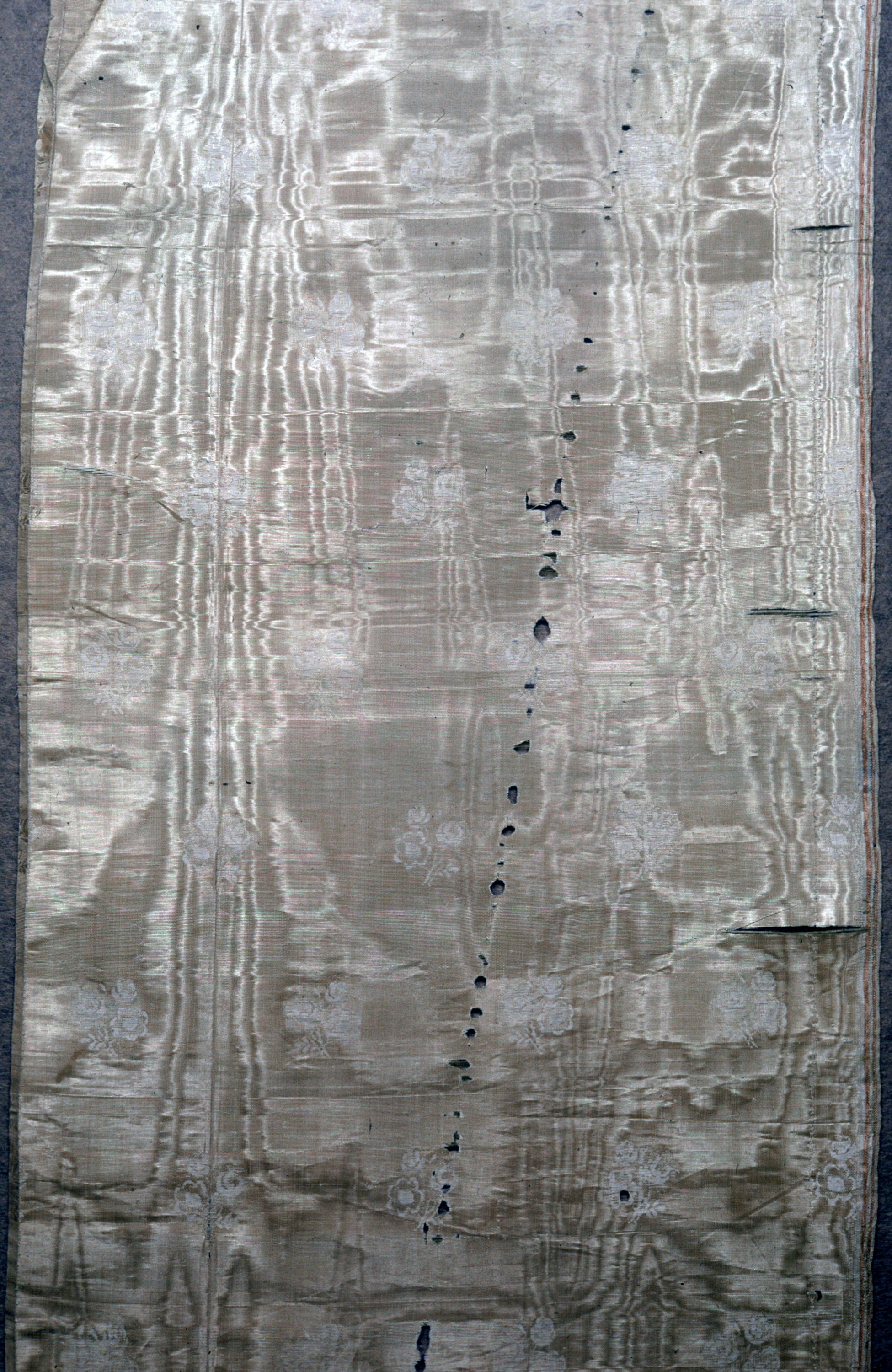 This is a moire silk. It is dated late 18th century–early 19th century and we acquired it in 1931. Its medium is silk. It is a part of the Textiles department.