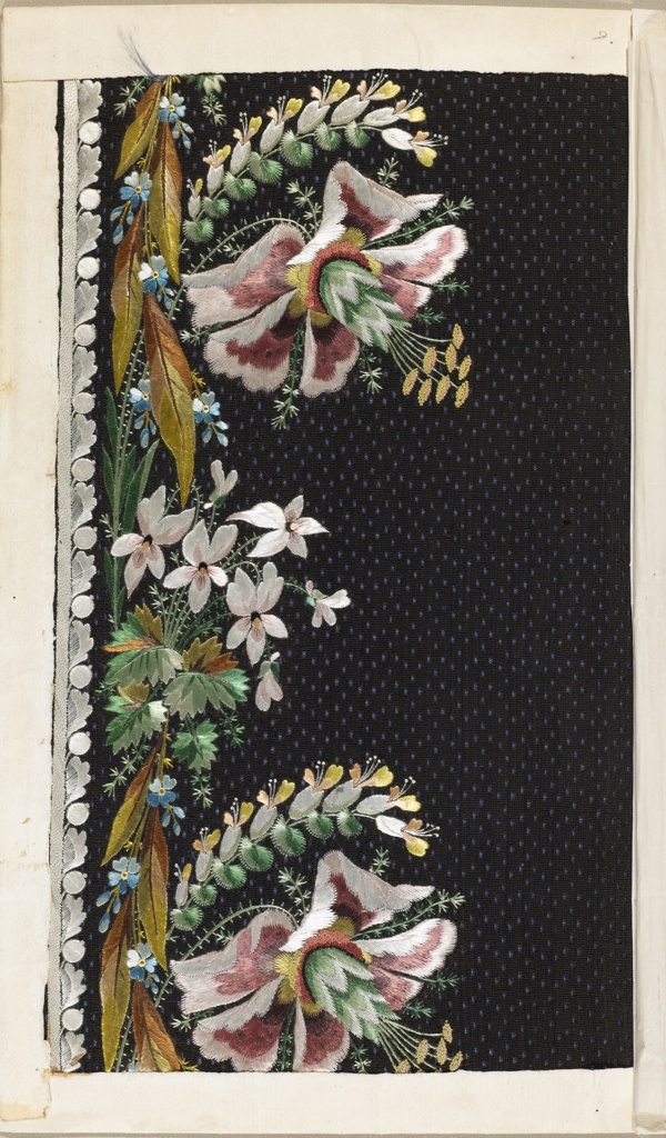These embroidery samples haven been in their original paper enclosures for over 200 years, preserving their brilliant color and pristine condition. The samples likely represent designs for men’s coats although embroidery houses could produce designs on any fabric according to a client’s wishes. While consumers in Paris could visit the marchand-merciers (retailers) to see samples in person, these paper envelopes were highly portable, meaning selling agents could take orders from customers far removed from the city center. Paris was widely recognized as the capital of fashion, and this perception was due mainly to the large volume of high-quality textiles produced in Lyon specifically for the Paris trade. By the 18th century, the textile industry in Lyon employed thousands of men and women. Local government and business leaders recognized Lyon’s special place in the textile design and production—it was the first to introduce seasonal changes in silk design. With the goal of training the next generation of textile designers, in 1756 leaders proposed opening a free school for flower painting under the leadership of a flower specialist with some knowledge of fabric design. It was not until the end of the century that the school produced its finest graduate, the talented designer Jean François Bony (French, 1754–1825), whose influence here is evident.