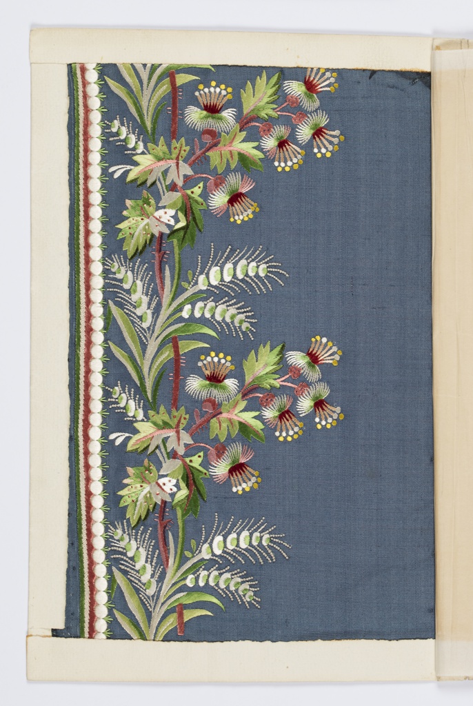 This is a Embroidery sample. It is dated 1790–1800 and we acquired it in 1932. Its medium is silk, paper and its technique is embroidered in satin, stem and knot stitches on warp-faced plain weave; in paper envelope. It is a part of the Textiles department.