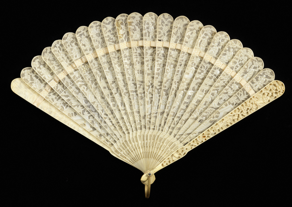 This is a Brisé fan. It is dated 19th century and we acquired it in 1935. Its medium is ivory sticks carved à jour, silk ribbon. It is a part of the Textiles department.