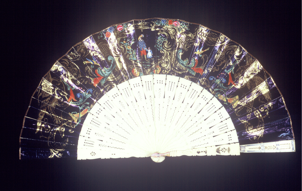 Pleated Fan (France); paper leaf with hand-colored lithograph, pierced and gilded bone sticks; H x W: 24.1 x 46.7 cm (9 1/2 x 18 3/8 in.); Gift of Mrs. George B. McClellan; 1935-2-9