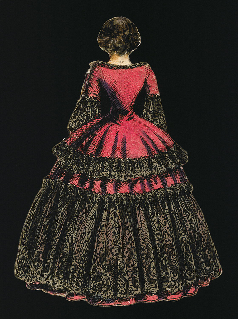 Print, Paper Doll Costume in Pink with Black Lace and Yellow Bodice; USA; lithograph, brush and watercolor on cream heavy wove paper; H x W: 7.2 x 6.2 cm (2 13/16 x 2 7/16 in.), irregular; Gift of Grace Lincoln Temple; 1937-22-20