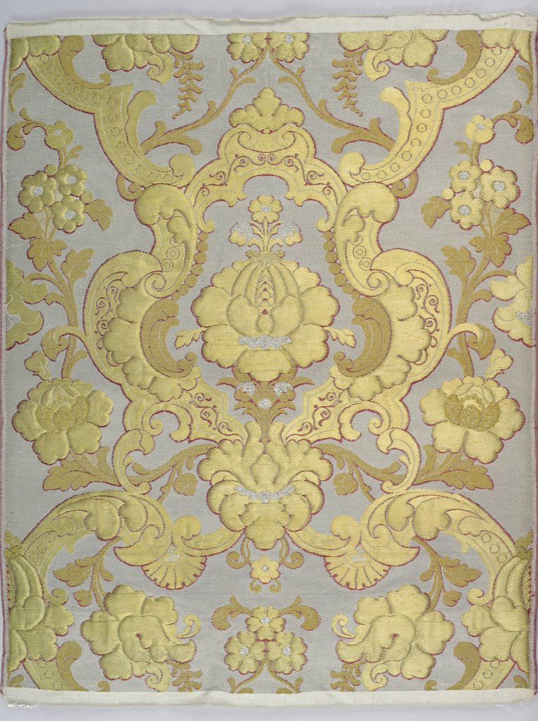This is a Sample. It is dated 1815–20 and we acquired it in 1937. Its medium is silk, metallic thread and its technique is twill weave with supplementary weft. It is a part of the Textiles department.