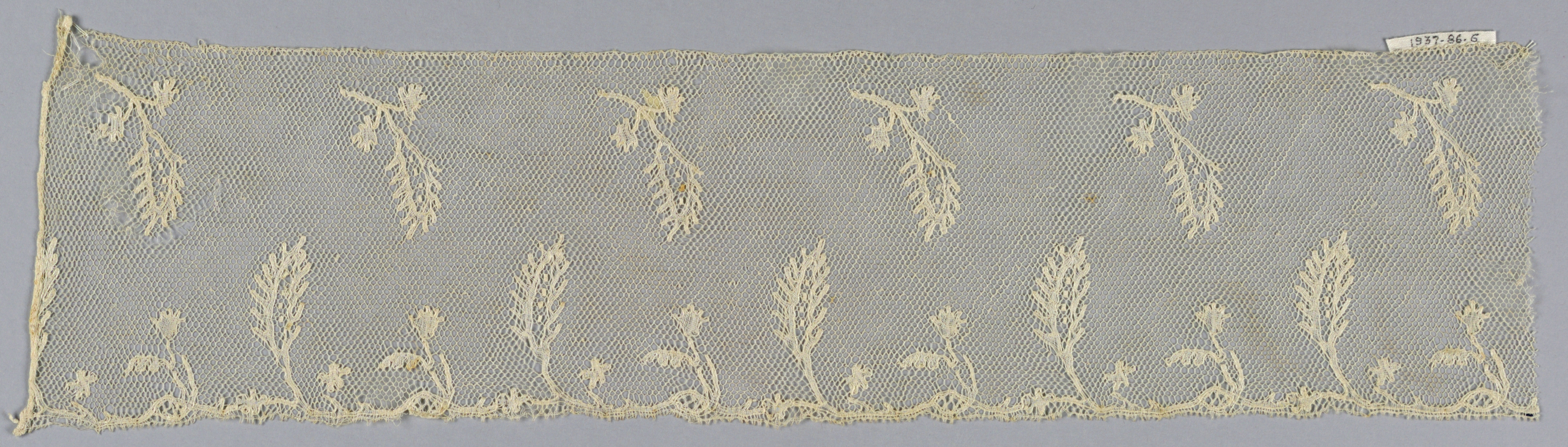 This is a Edge. It is dated 19th century and we acquired it in 1937. Its medium is linen and its technique is bobbin lace made in lille style with heavy outlining thread. It is a part of the Textiles department.