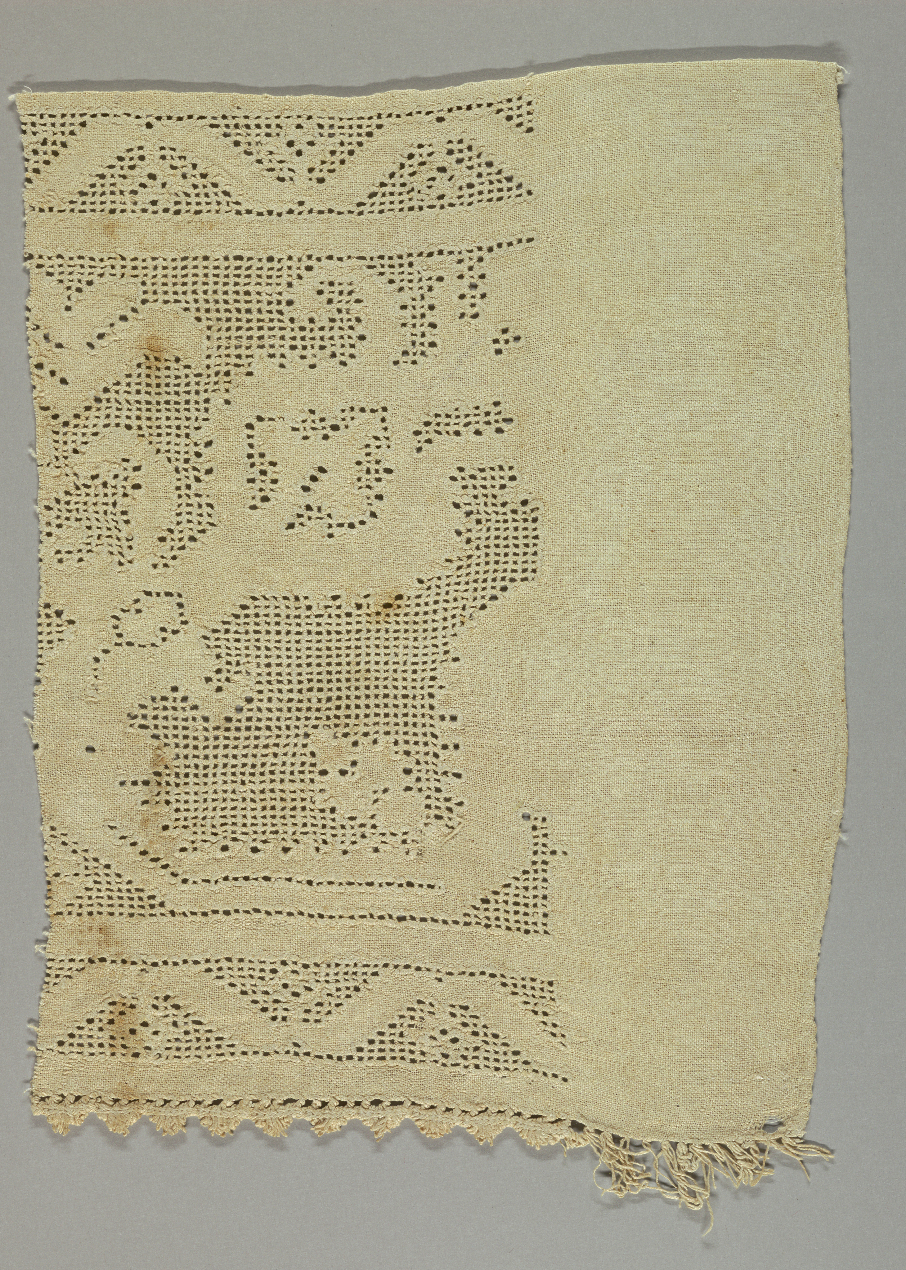 This is a Fragment. It is dated 16th century and we acquired it in 1938. Its medium is linen and its technique is withdrawn element with embroidery stitches. It is a part of the Textiles department.