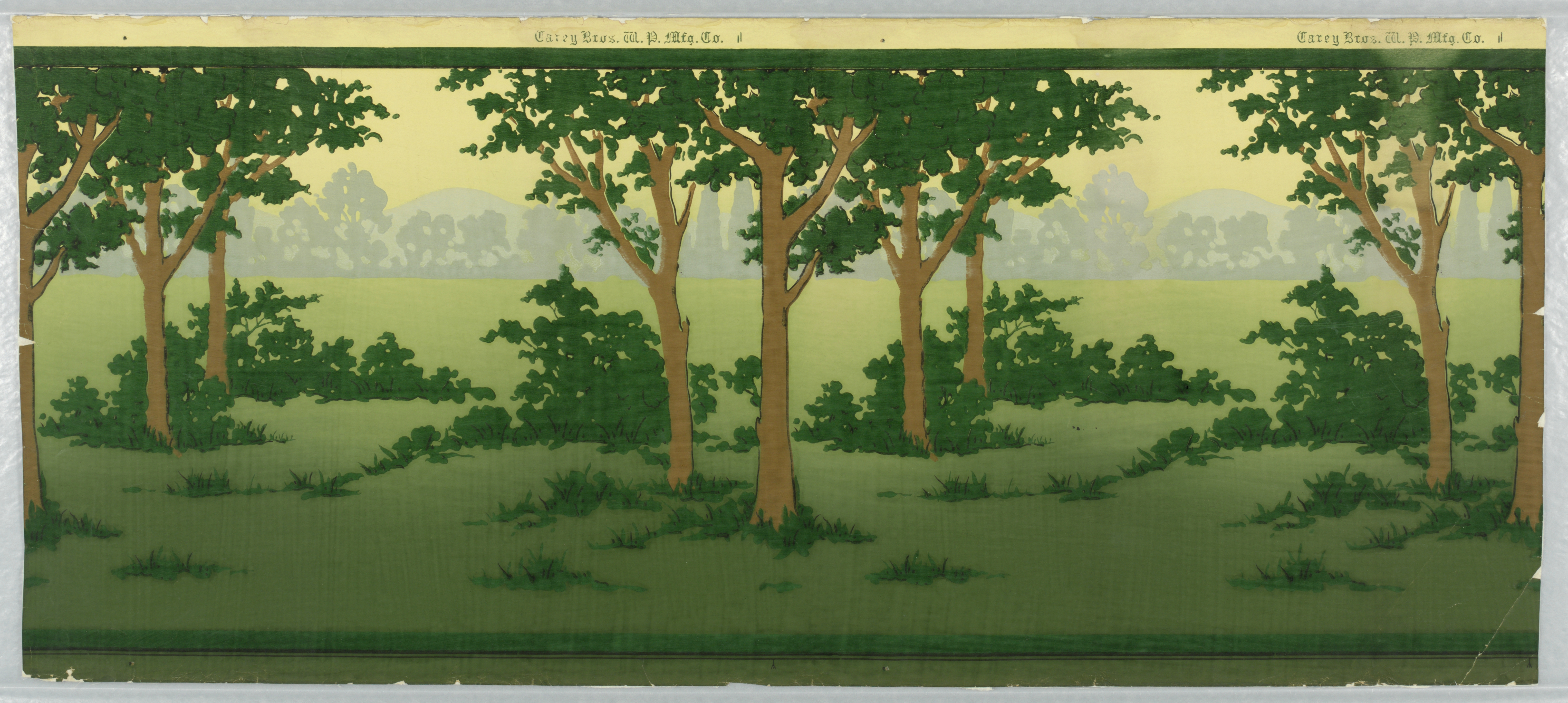 This is a frieze. It was manufactured by Carey Bros. W.P. Mfg. Co.. It is dated 1900–05 and we acquired it in 1938. Its medium is machine-printed, distemper colors. It is a part of the Wallcoverings department.