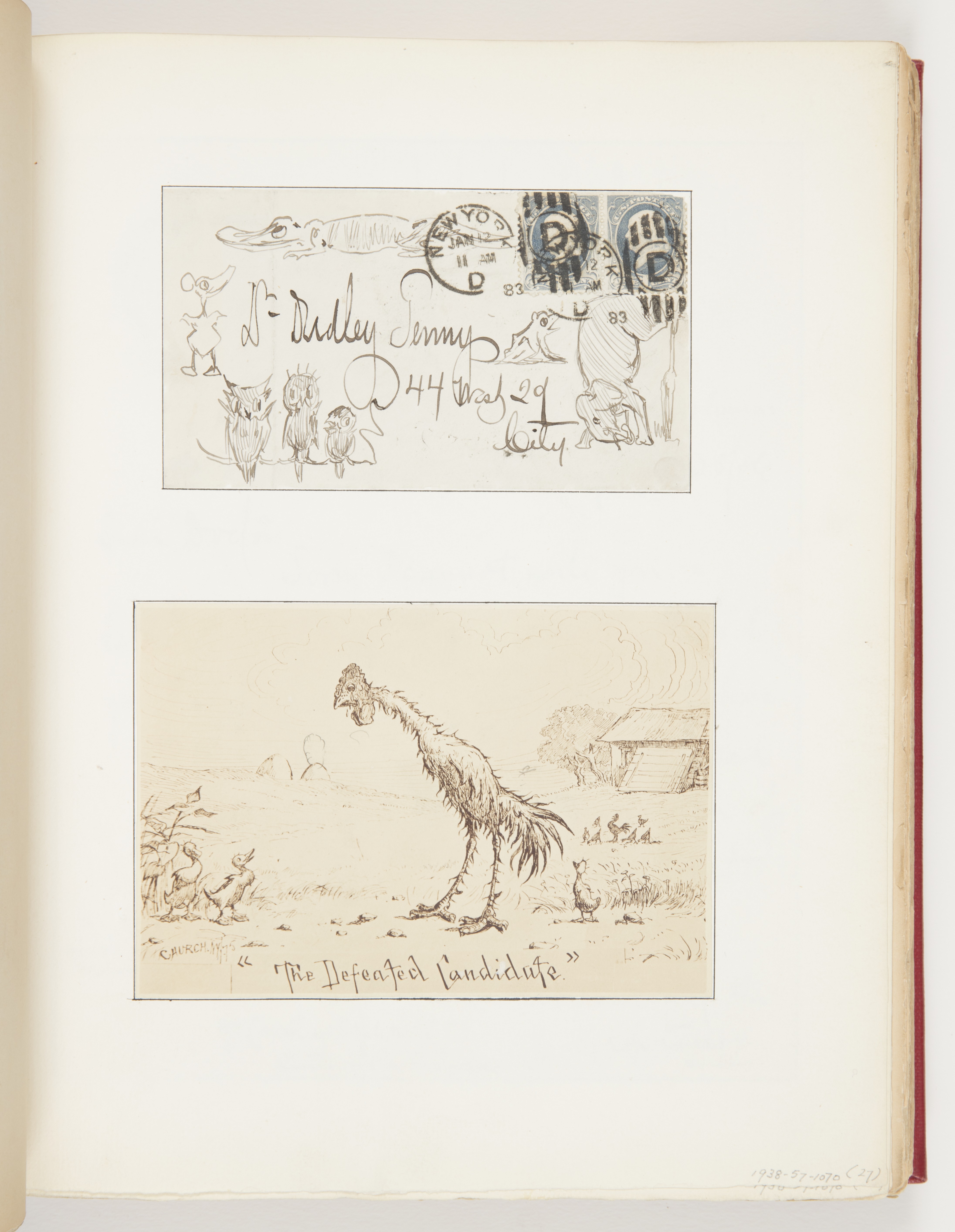 Above (envelope): Inscribed in pen and black ink, center: Dr. Dudley Tenny / 44 West 29 / City. Below (published illustration): Printed in brown ink, lower center: “The Defeated Candidate.”