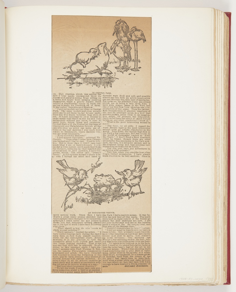 Ephemera, A Painter of Animals, Excerpt from The Boston Globe (March 23, 1890, p. 18); Illustrated by Frederick Stuart Church (American, 1842–1924); Collected by Dr. Dudley Tenney (New York City); USA; 30.2 × 23.5 cm (11 7/8 × 9 1/4 in.); Bequest of Erskine Hewitt; 1938-57-1070-95
