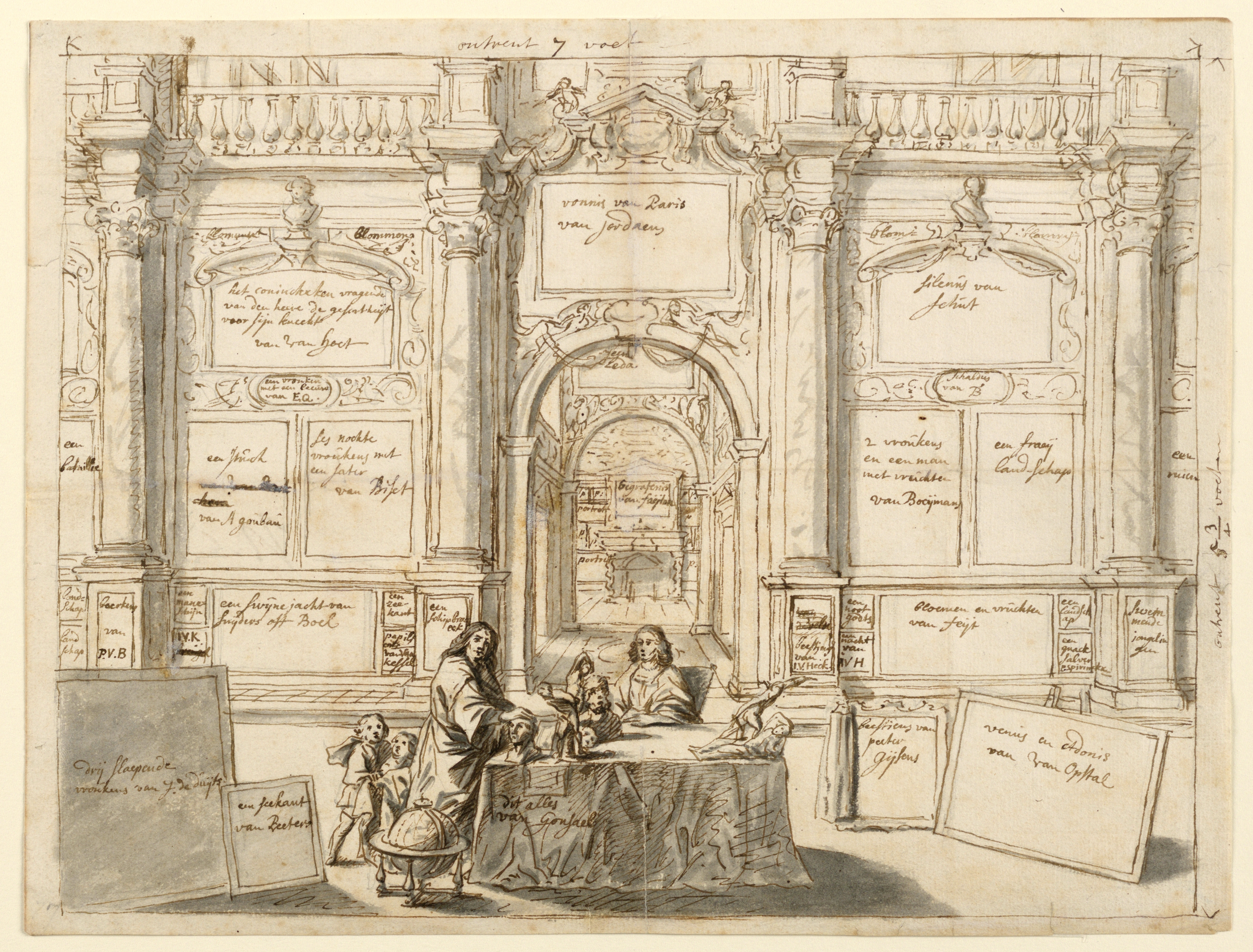 Drawing, Diagram of a painting by Gonzales Coques and others, "Interior with Figures in a Picture Gallery," 1672 (Mauritshuis)