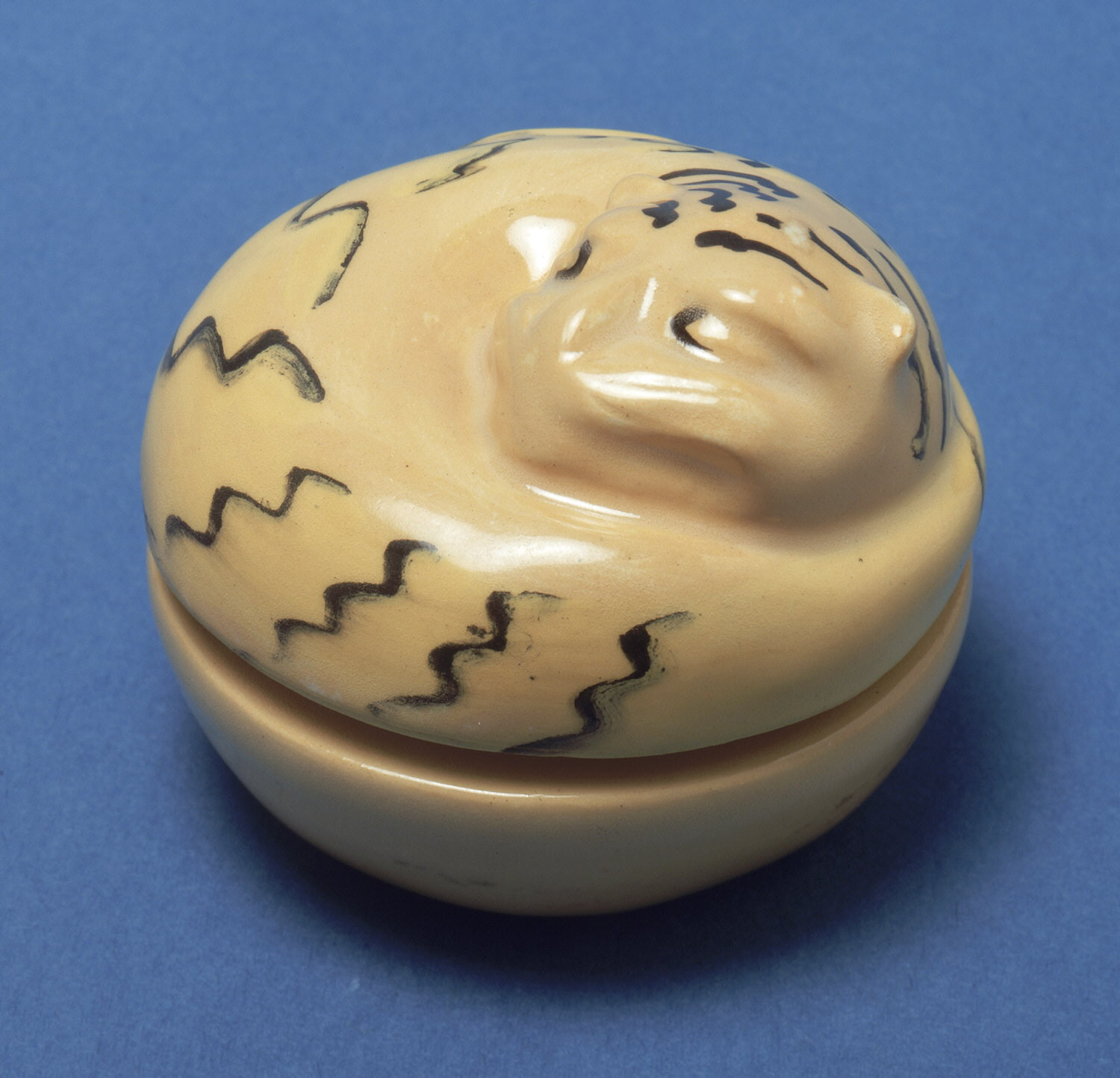 This is a Box and lid. It is dated 19th century and we acquired it in 1938. Its medium is stoneware, glazed enamel. It is a part of the Product Design and Decorative Arts department.