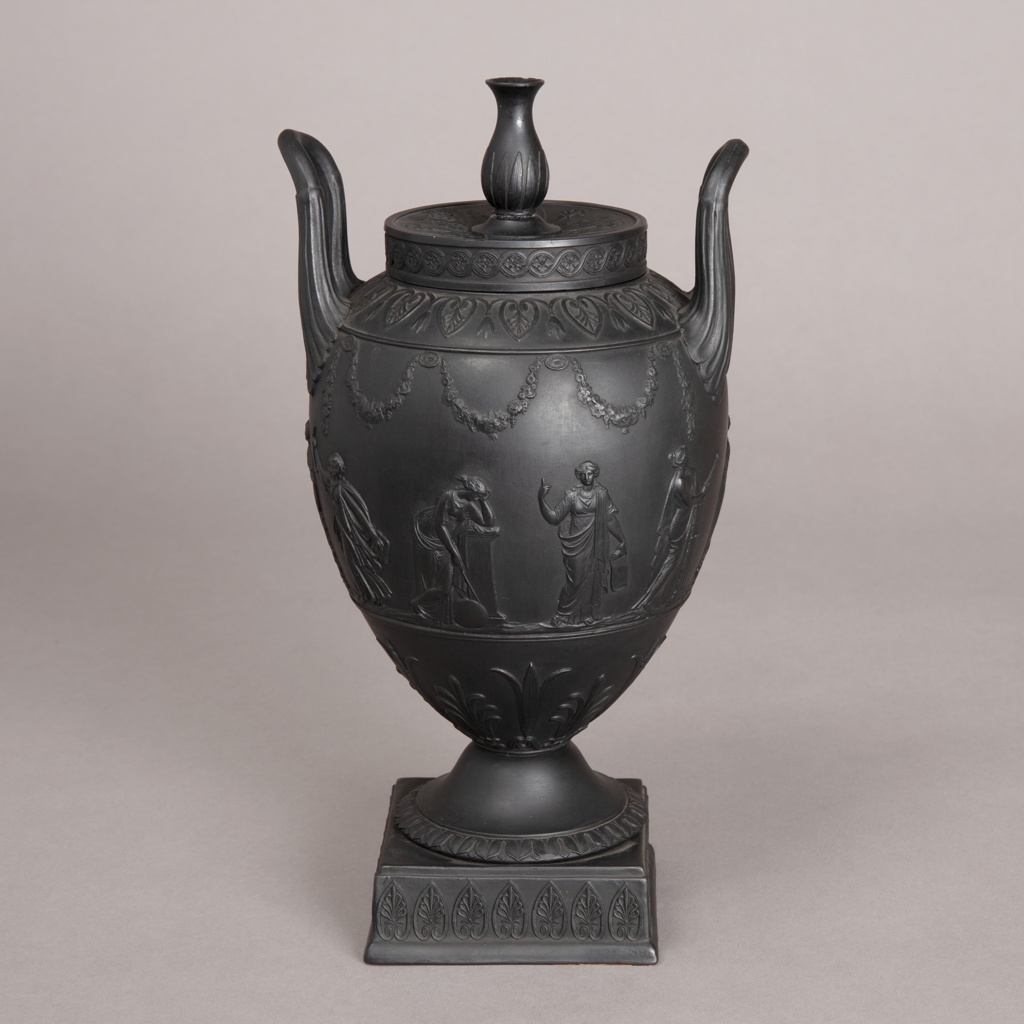 This is a urn. It was decorated by John Flaxman and manufactured by Wedgwood. It is dated 1780–1800 and we acquired it in 1938. Its medium is stoneware ("black basalt"). It is a part of the Product Design and Decorative Arts department.