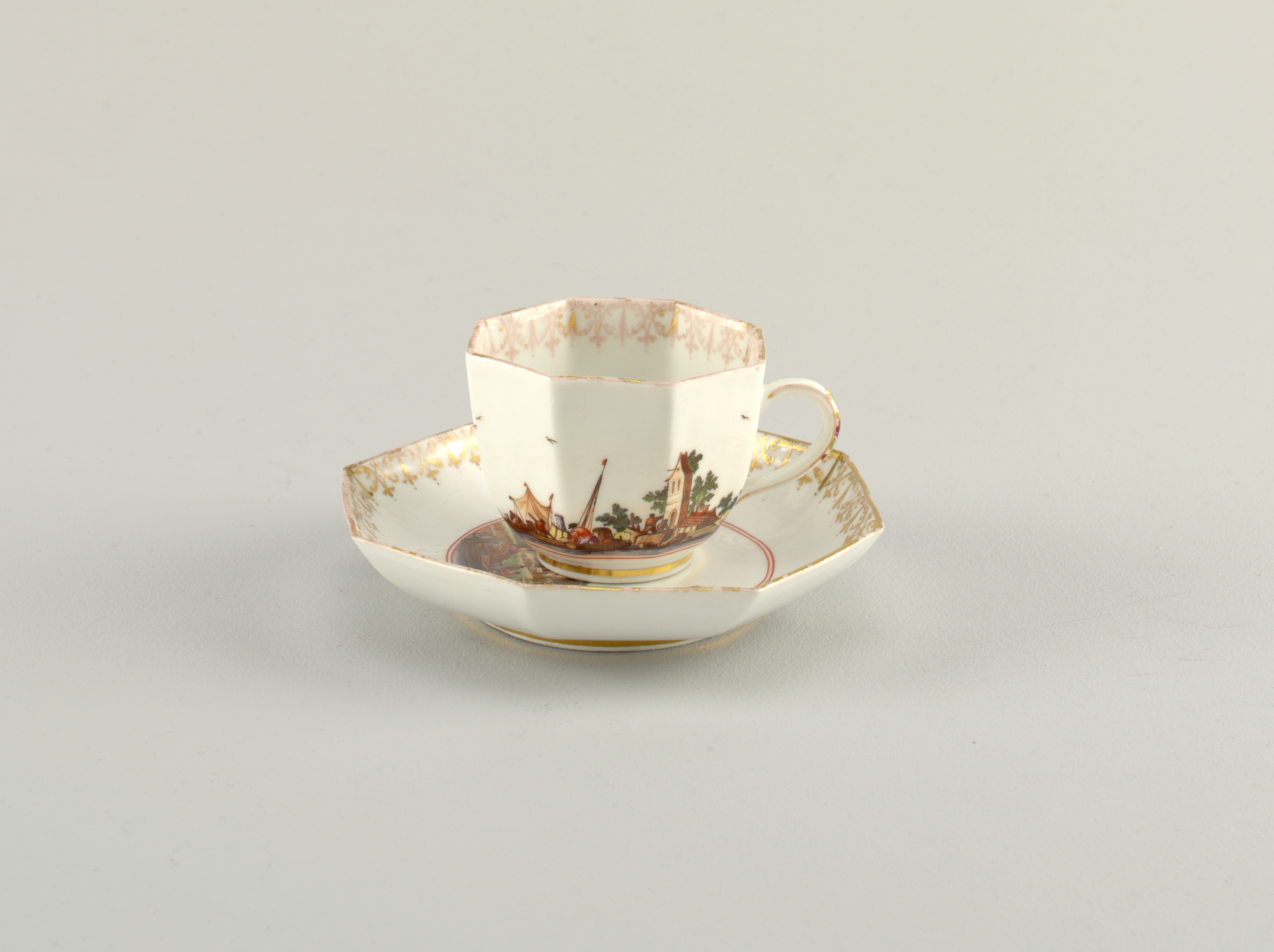 Octagonal Cup and Saucer Cup And Saucer; Manufactured by Meissen Porcelain Factory (Germany), Meissen Porcelain Manufactory (Germany); Style of Johann Georg Heintze (German, 1707 - after 1749); hard paste porcelain, vitreous enamel, gold; H x W x D (a: cup): 5.3 × 9.6 × 7.2 cm (2 1/16 × 3 3/4 × 2 13/16 in.) H x diam. (b: saucer): 2.7 × 14.5 cm (1 1/16 × 5 11/16 in.); Bequest of Erskine Hewitt; 1938-57-439-a,b