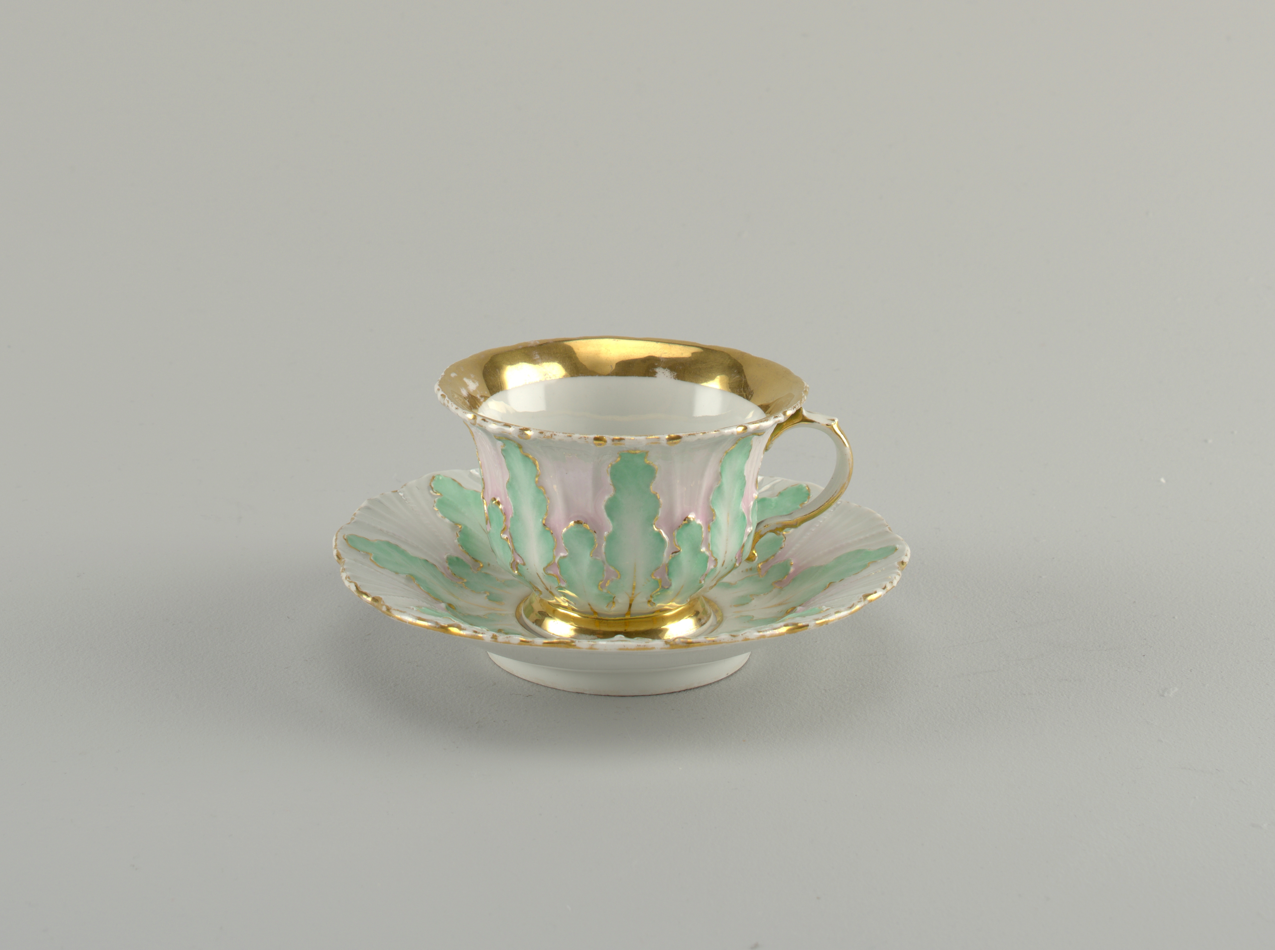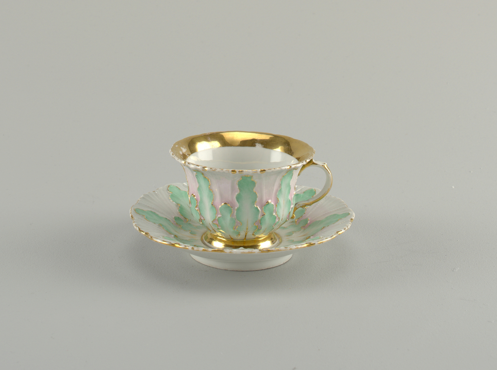 This is a cup and saucer. It was manufactured by Meissen Porcelain Manufactory. It is dated 1840–1850 and we acquired it in 1938. Its medium is hard paste porcelain, vitreous enamel, gold. It is a part of the Product Design and Decorative Arts department.