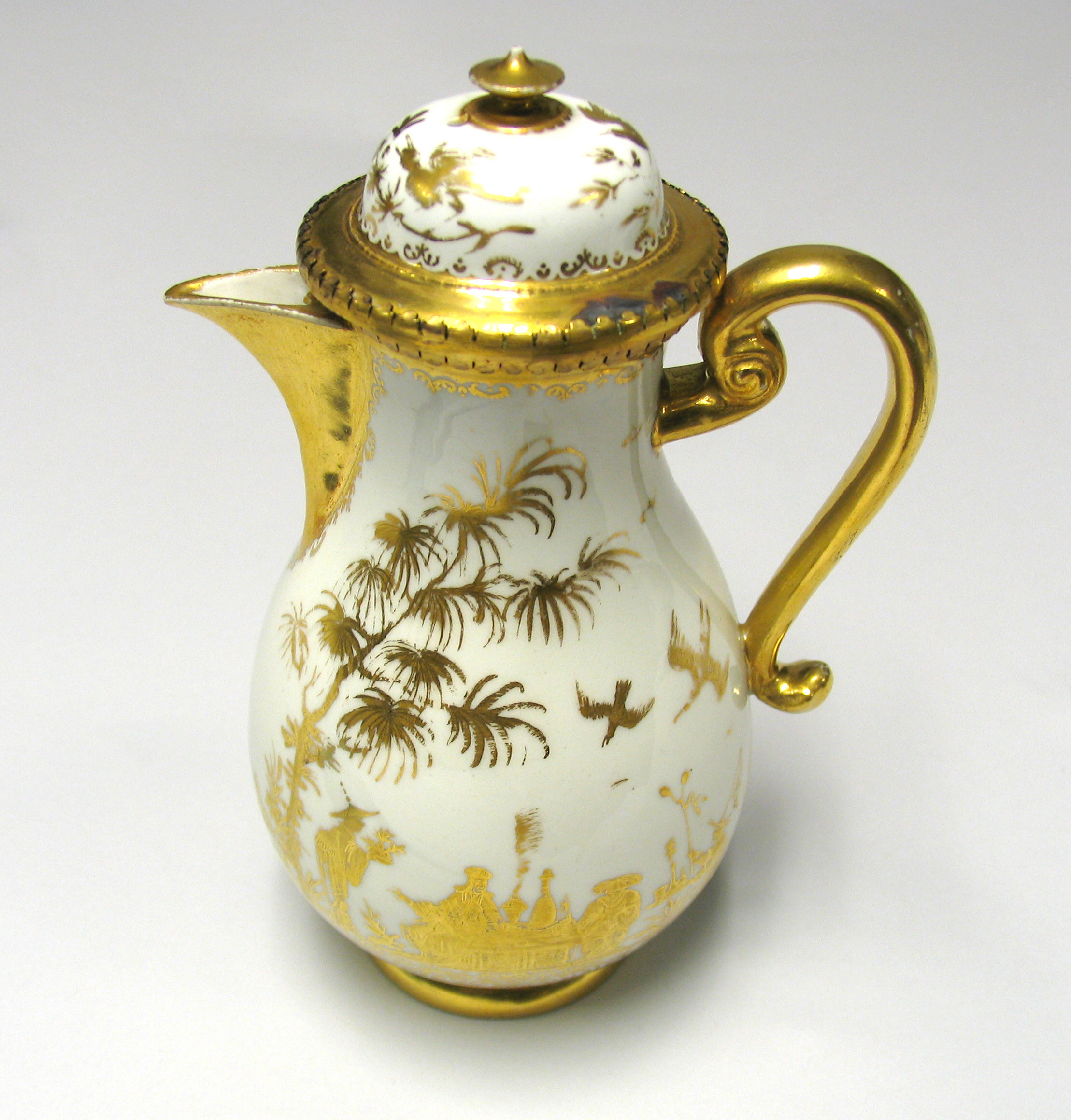 This is a coffeepot. It was manufactured by Meissen Porcelain Manufactory and Meissen Porcelain Factory and gilded by Bartholomäus Seuter. It is dated 1725–1735 and we acquired it in 1938. Its medium is hard paste porcelain, gold. It is a part of the Product Design and Decorative Arts department.