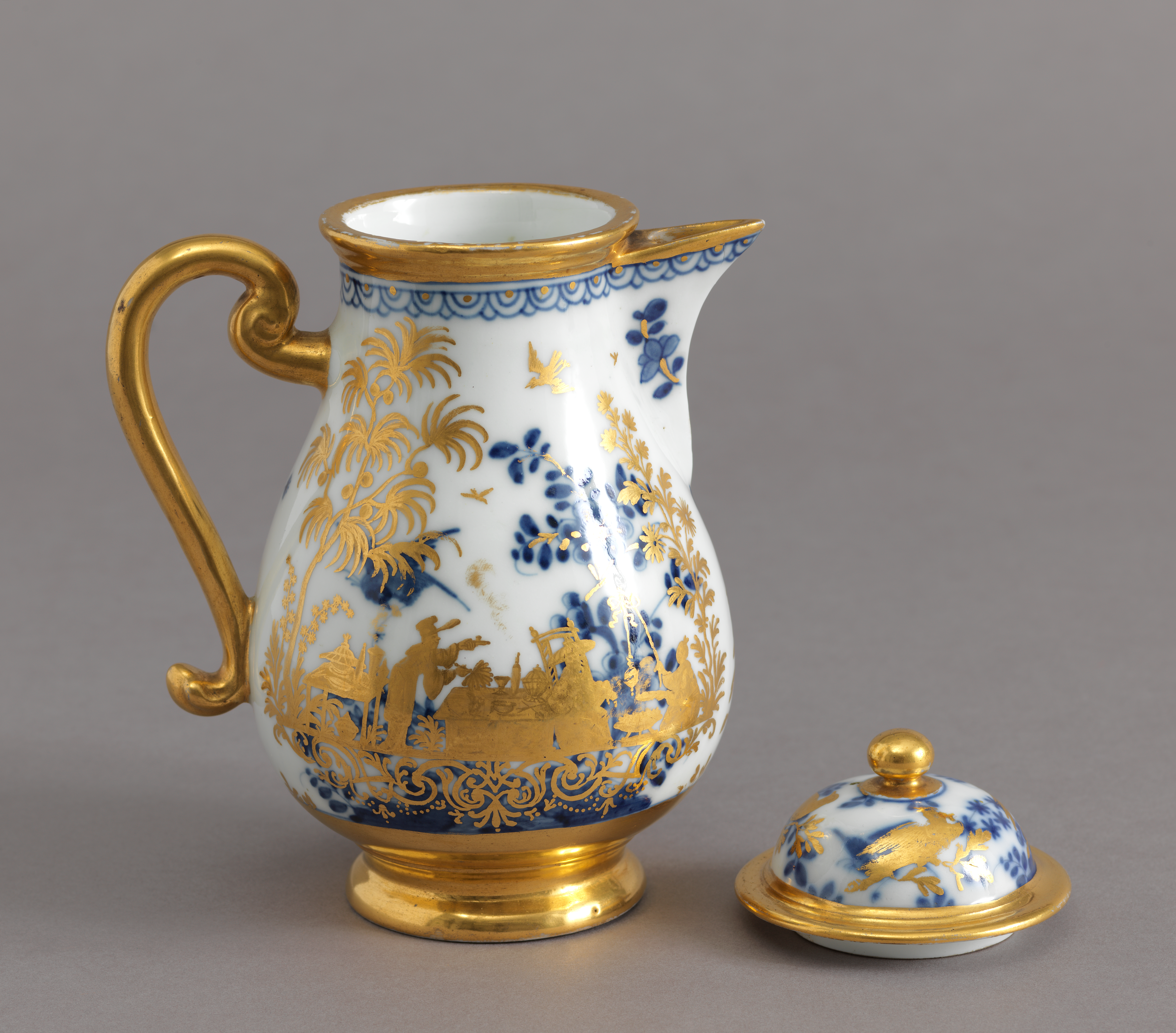 This is a coffeepot. It was manufactured by Meissen Porcelain Manufactory and gilded by Bartholomäus Seuter. It is dated 1725–1735 and we acquired it in 1938. Its medium is hard paste porcelain, vitreous enamel, gold, brass. It is a part of the Product Design and Decorative Arts department.