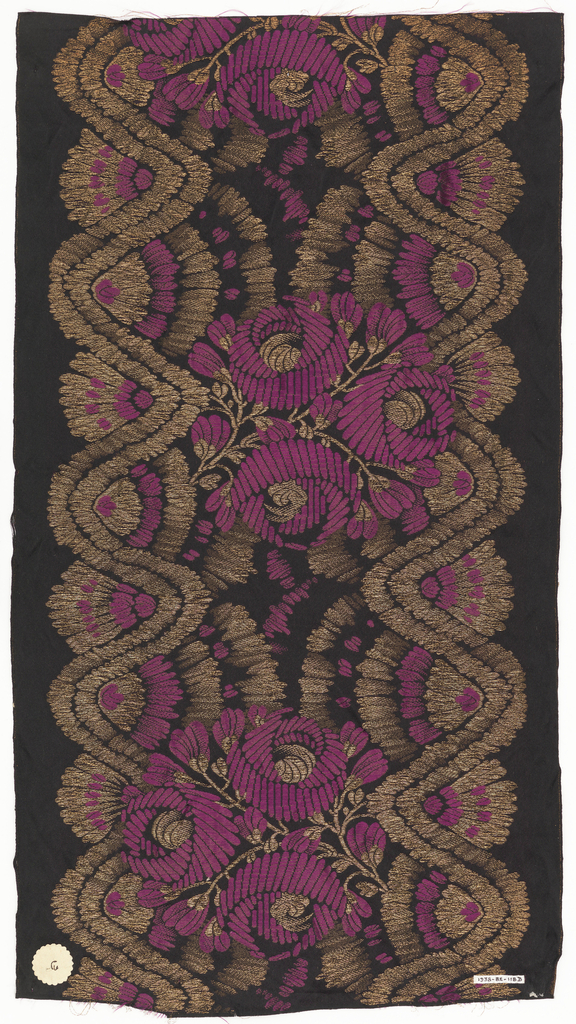 This is a Ribbon samples. It is dated ca. 1919 and we acquired it in 1938. Its medium is silk, metallic thread and its technique is compound satin weave. It is a part of the Textiles department.