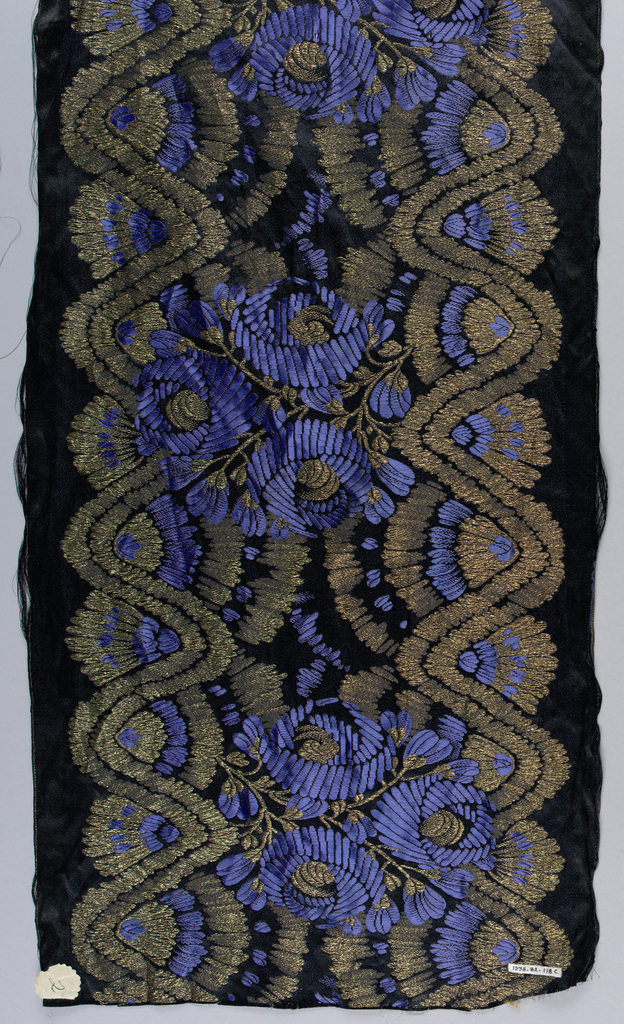 This is a Ribbon samples. It is dated ca. 1919 and we acquired it in 1938. Its medium is silk, metallic thread and its technique is compound satin weave. It is a part of the Textiles department.