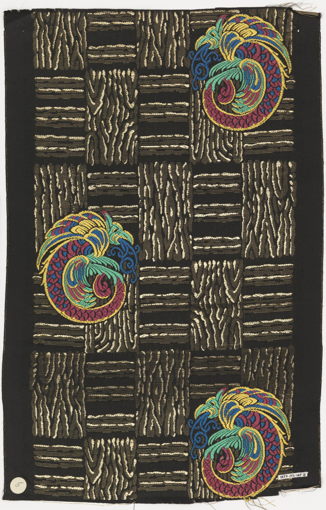 This is a Ribbons. It is dated ca. 1919 and we acquired it in 1938. Its medium is silk, metallic thread and its technique is compound satin weave with supplementary weft. It is a part of the Textiles department.