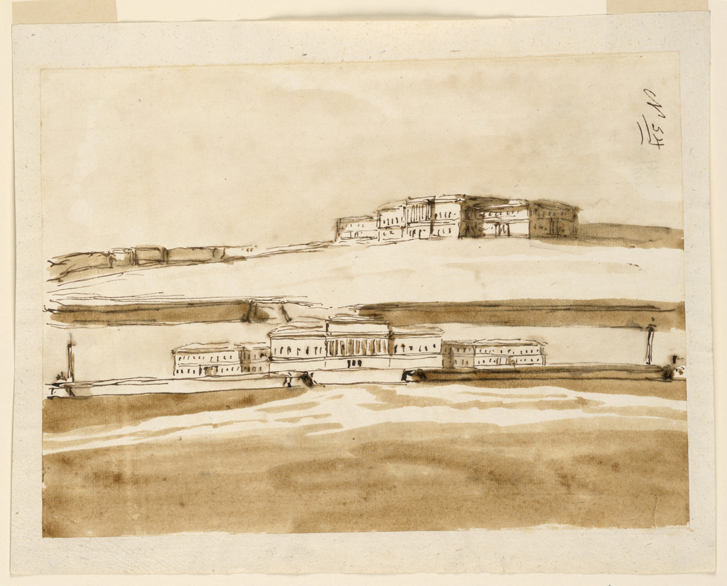 Drawing, Palace; Designed by Giuseppe Barberi (Italian, 1746–1809); Italy; pen and brown ink, brush and brown wash on lined off-white laid paper; 19.9 x 27.5 cm (7 13/16 x 10 13/16 in.); Museum purchase through gift of various donors and from Eleanor G. Hewitt Fund; 1938-88-1108