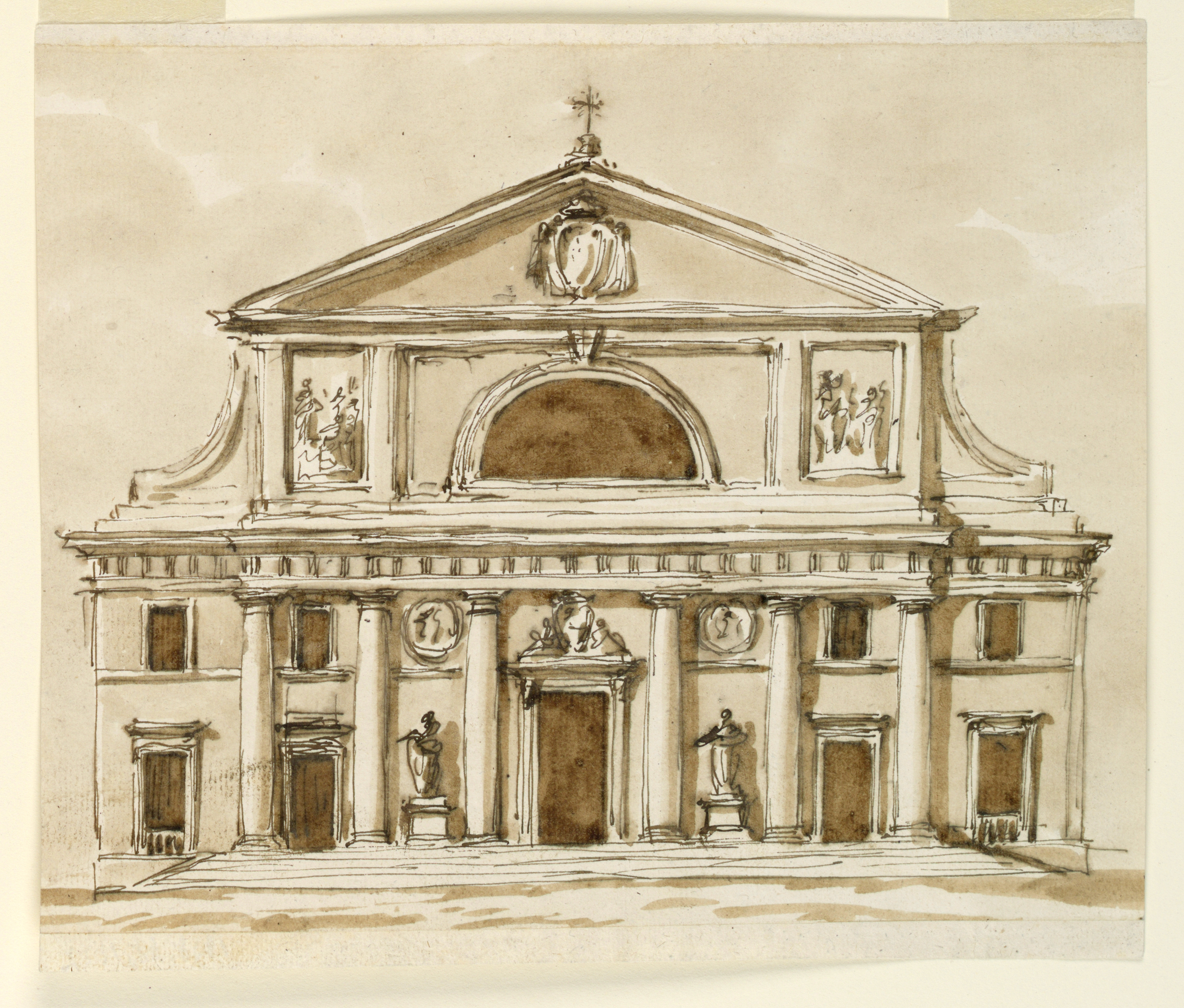 Drawing, Elevation of a church; Designed by Giuseppe Barberi (Italian, 1746–1809); Italy; pen and brown ink, brush and brown wash on lined off-white laid paper; 19.9 x 24.9 cm (7 13/16 x 9 13/16 in.); Museum purchase through gift of various donors and from Eleanor G. Hewitt Fund; 1938-88-1222