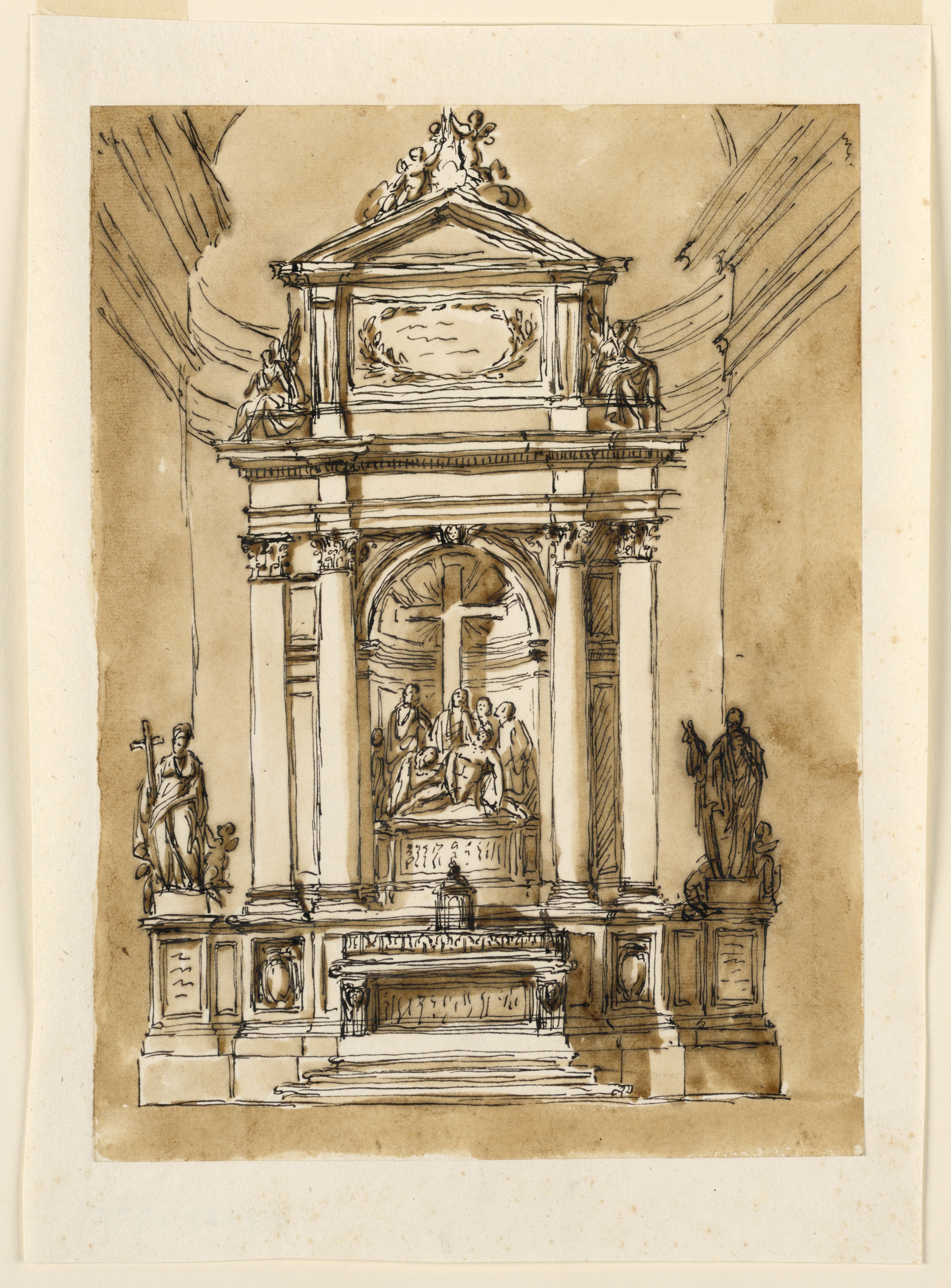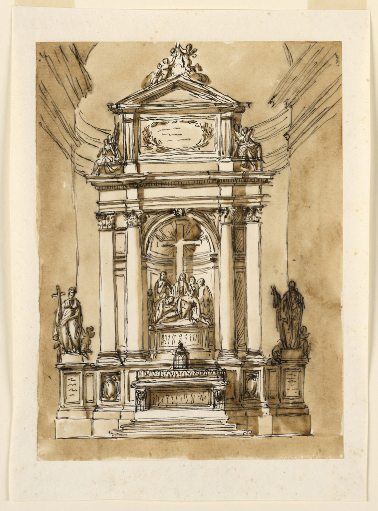 Drawing, Design for a Main Altar; Designed by Giuseppe Barberi (Italian, 1746–1809); Italy; pen and brown ink, brush and brown wash on lined off-white laid paper; 27.6 x 20.1 cm (10 7/8 x 7 15/16 in.); Museum purchase through gift of various donors and from Eleanor G. Hewitt Fund; 1938-88-1372