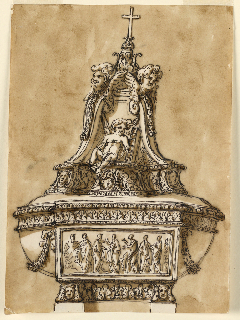 Drawing, Design for a Baptismal Font; Designed by Giuseppe Barberi (Italian, 1746–1809); Italy; pen and brown ink, brush and brown wash on lined off-white laid paper; 27.4 x 19.9 cm (10 13/16 x 7 13/16 in.); Museum purchase through gift of various donors and from Eleanor G. Hewitt Fund; 1938-88-1425