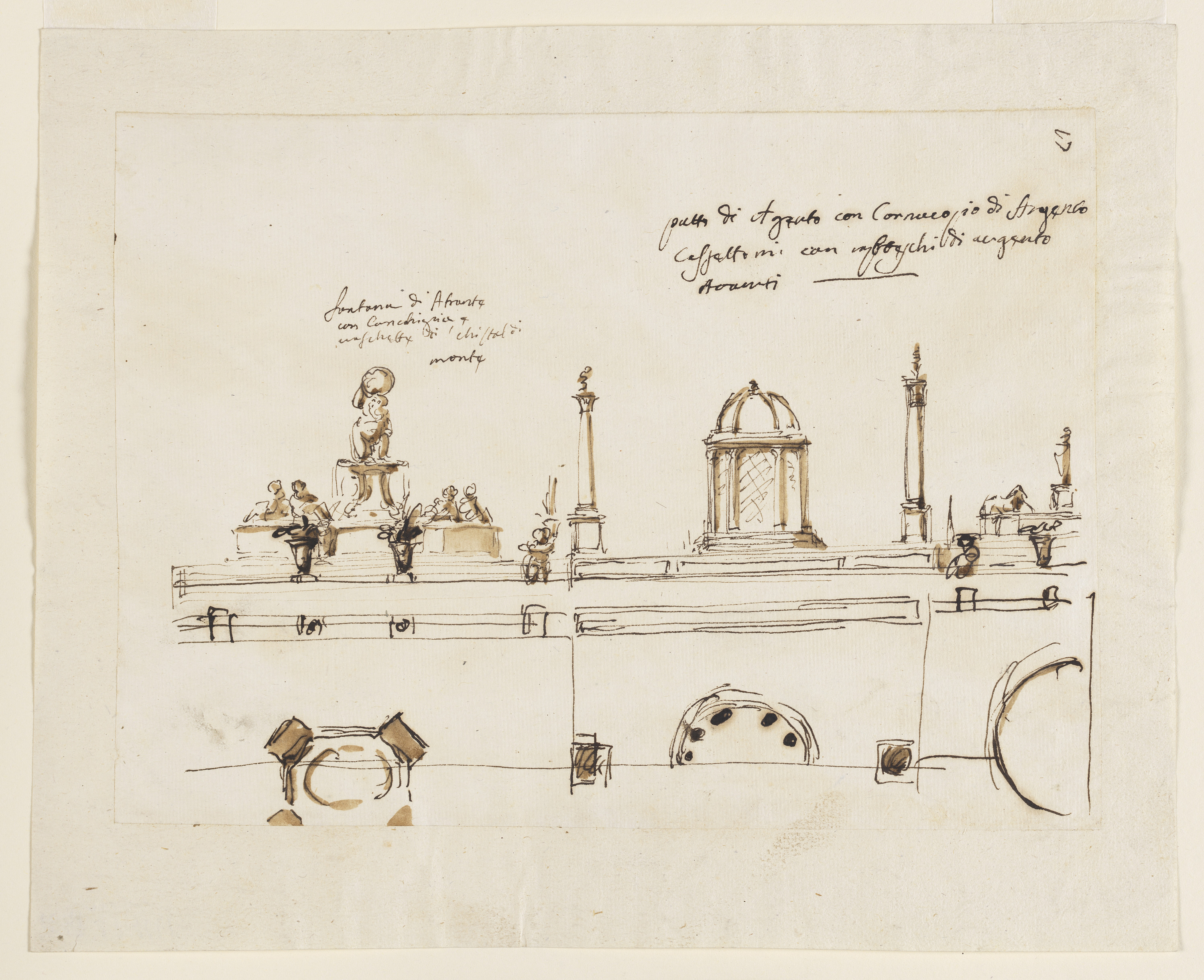 This is a Drawing. It was designed by Giuseppe Barberi and architect: Giuseppe Barberi. It is dated 1790-1795 and we acquired it in 1938. Its medium is pen and brown ink, brush and brown wash on lined off-white laid paper. It is a part of the Drawings, Prints, and Graphic Design department.