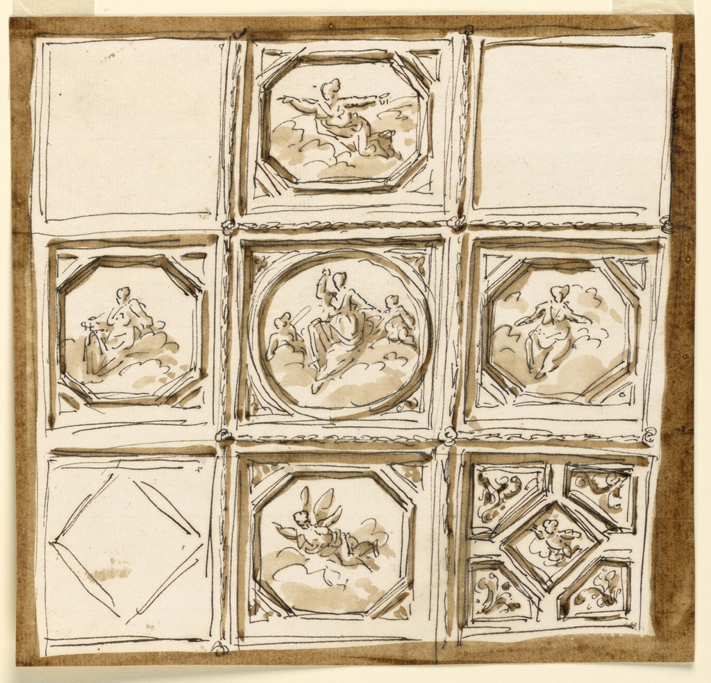 Drawing, Design for Ceiling Decoration; Designed by Giuseppe Barberi (Italian, 1746–1809); Italy; pen and brown ink, brush and brown wash on off-white laid paper; Image: 18.9 x 19.6 cm (7 7/16 x 7 11/16 in.); Museum purchase through gift of various donors and from Eleanor G. Hewitt Fund; 1938-88-1586