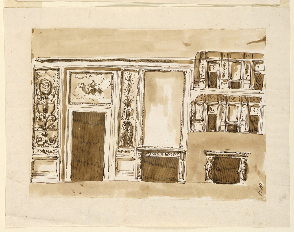 Drawing, Wall Elevation; Designed by Giuseppe Barberi (Italian, 1746–1809); Italy; pen and brown ink, brush and brown wash on off-white laid paper, lined; Image: 19.6 x 27.5 cm (7 11/16 x 10 13/16 in.); Museum purchase through gift of various donors and from Eleanor G. Hewitt Fund; 1938-88-1594