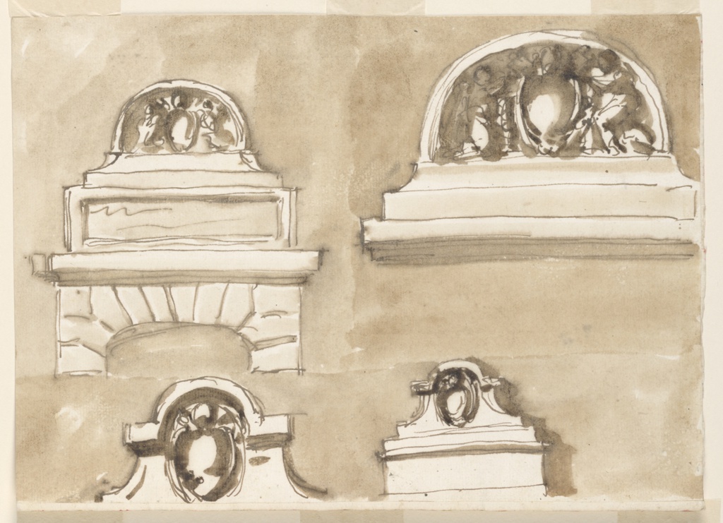 Drawing, Designs for an overdoor with a papal escutcheon; Architect: Giuseppe Barberi (Italian, 1746–1809); Italy; pen and brown ink, brush and brown wash; Image: 18.8 x 26.5 cm (7 3/8 x 10 7/16 in.); Museum purchase through gift of various donors and from Eleanor G. Hewitt Fund; 1938-88-1786