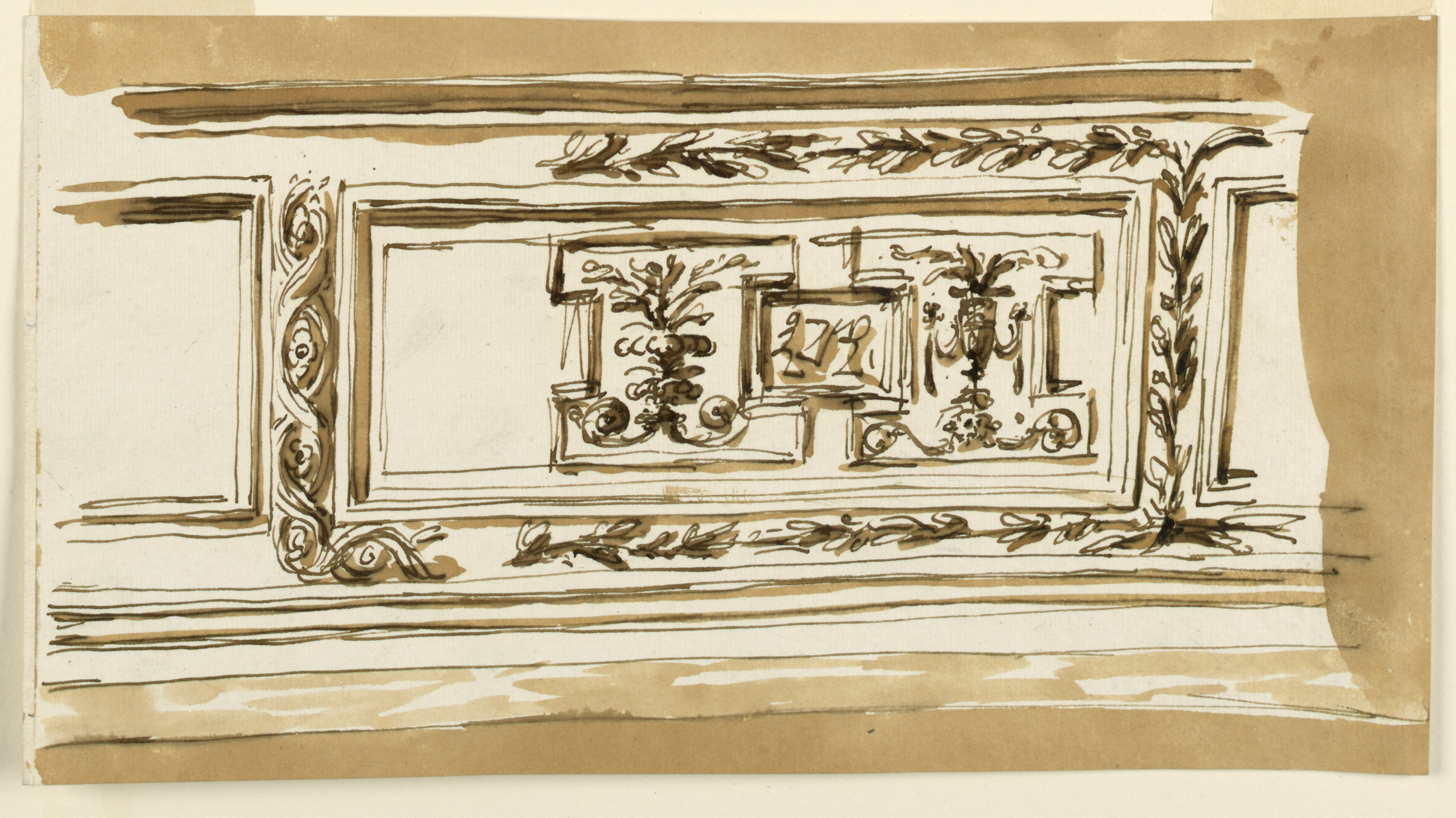 Drawing, Dado with alternative suggestions; Designed by Giuseppe Barberi (Italian, 1746–1809); Italy; pen and brown ink, brush and brown wash on off-white laid paper, lined; Image: 14.2 x 25.9 cm (5 9/16 x 10 3/16 in.); Museum purchase through gift of various donors and from Eleanor G. Hewitt Fund; 1938-88-1806