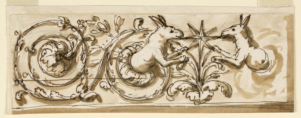 Drawing, Design for ceiling decoration; Designed by Giuseppe Barberi (Italian, 1746–1809); Italy; pen and brown ink, brush and brown wash on off-white laid paper, lined; Image: 7.3 x 20.5 cm (2 7/8 x 8 1/16 in.); Museum purchase through gift of various donors and from Eleanor G. Hewitt Fund; 1938-88-1871