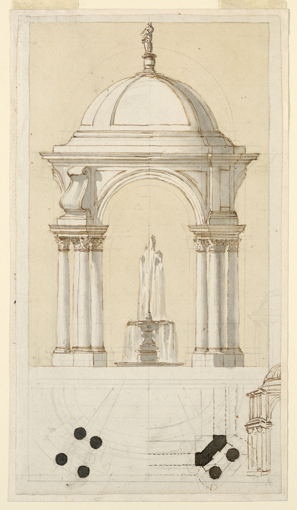 Drawing, Design for a Fountain in a Pavilion; Architect: Carlo Francesco Barabino (Italian, 1768 – 1835); Designed by Giuseppe Barberi (Italian, 1746–1809); Italy; pen and ink, pen and brown, gray wash, graphote on white laid paper, laid down; 33.3 × 18.8 cm (13 1/8 × 7 3/8 in.); Museum purchase through gift of various donors and from Eleanor G. Hewitt Fund; 1938-88-2127