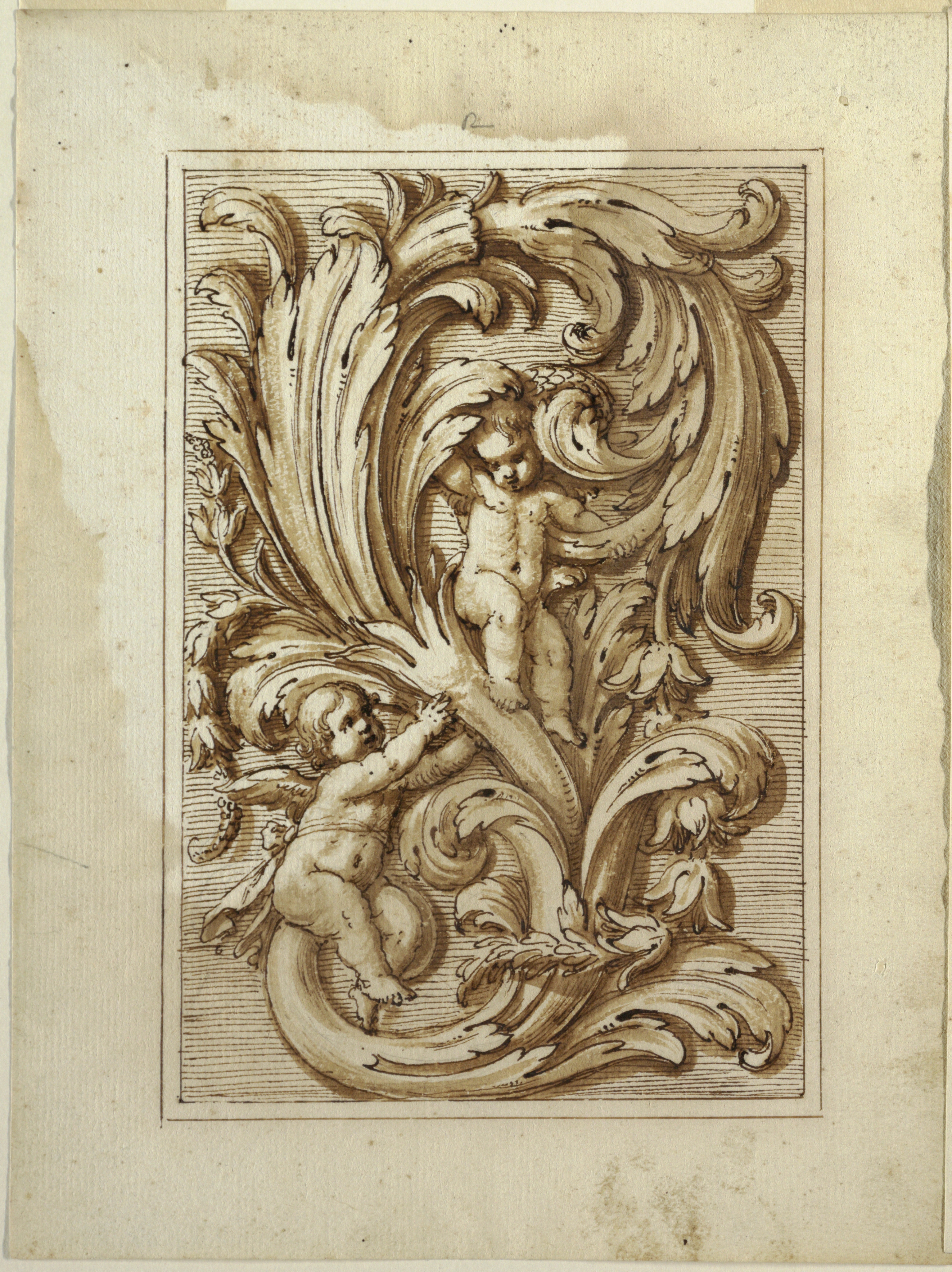 Drawing, One of a set of projects for a title page and for the decoration of a vertical panel; Francesco Bedeschini; Italy; pen, brush, sepia; H: 26.1cm W: 19.8cm; Museum purchase through gift of various donors and from Eleanor G. Hewitt Fund; 1938-88-2314