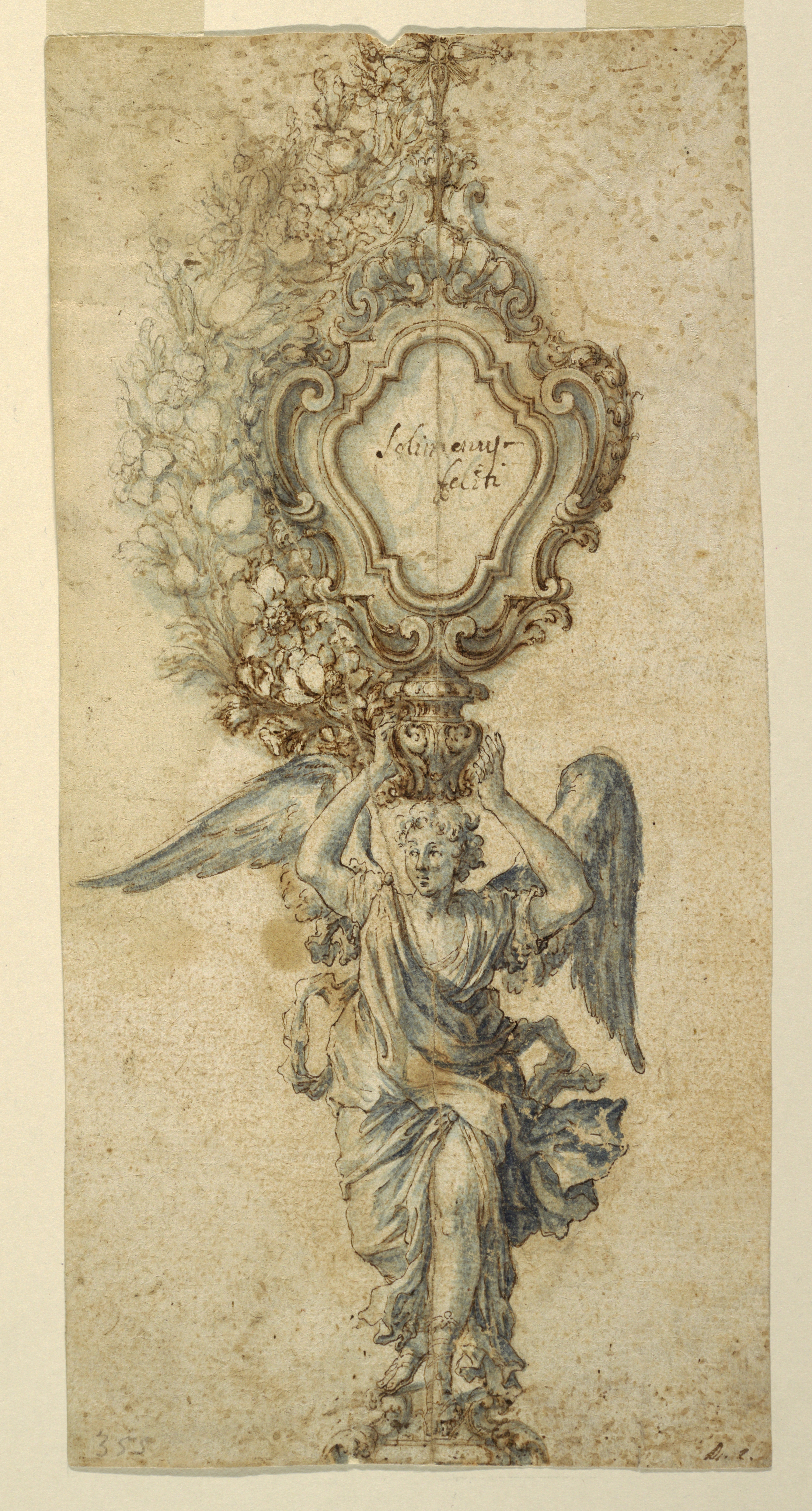 Drawing, Design for a Reliquary; Attributed to Francesco Solimena (Italian, 1657–1747); Italy; brush and blue wash, pen and brown ink, black chalk on paper; 34.1 x 16.7 cm (13 7/16 x 6 9/16 in.); Museum purchase through gift of various donors and from Eleanor G. Hewitt Fund; 1938-88-2571