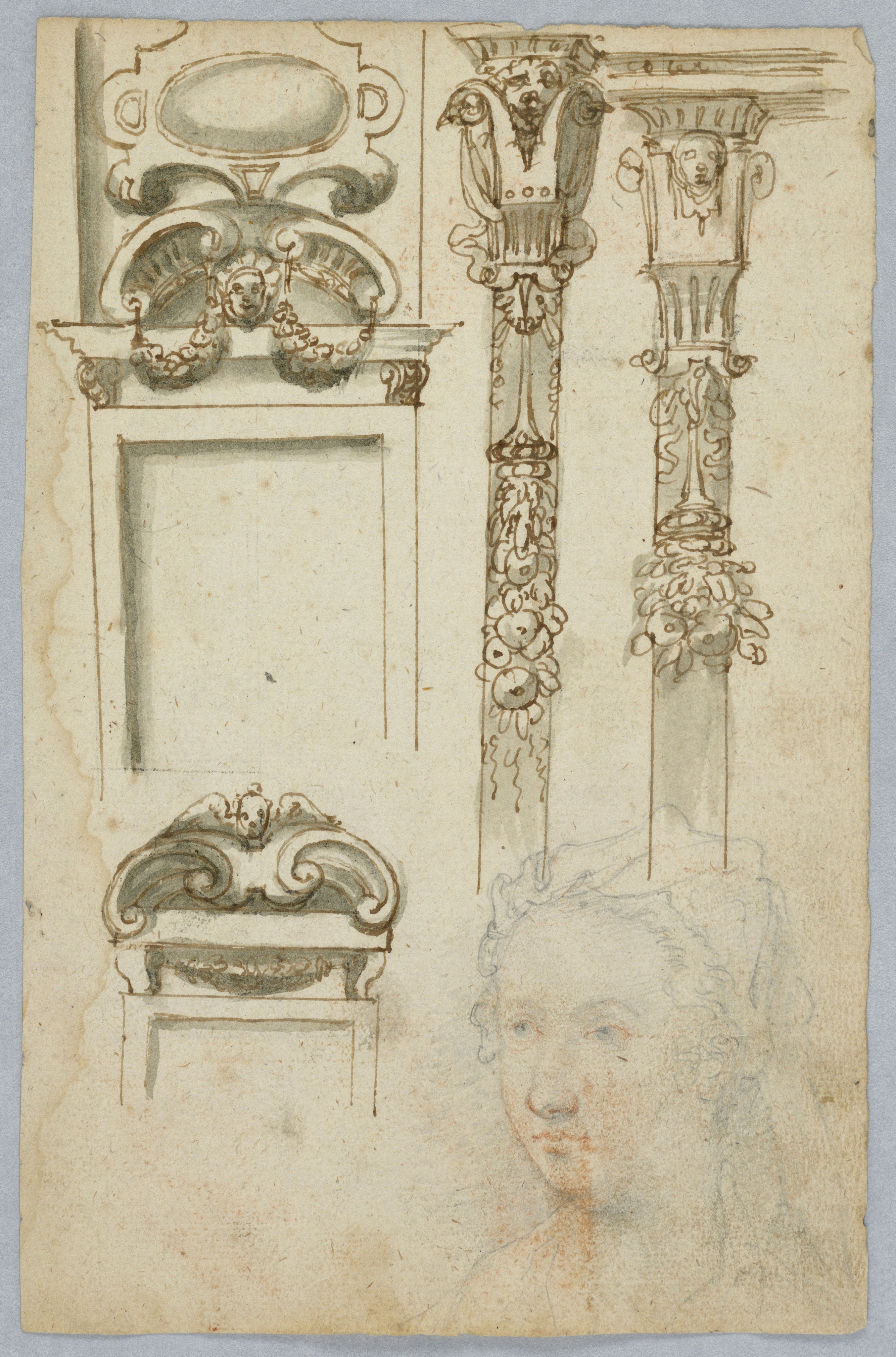 Drawing, Decorative Motifs and the Head of a Woman; Italy; black chalk, pen and ink, brush and grey watercolor washes, blotted red crayon, lead pencil on laid paper. on verso: red crayon on laid paper.; H x W: 21.7 × 14 cm (8 9/16 × 5 1/2 in.); Museum purchase through gift of various donors and from Eleanor G. Hewitt Fund; 1938-88-2617