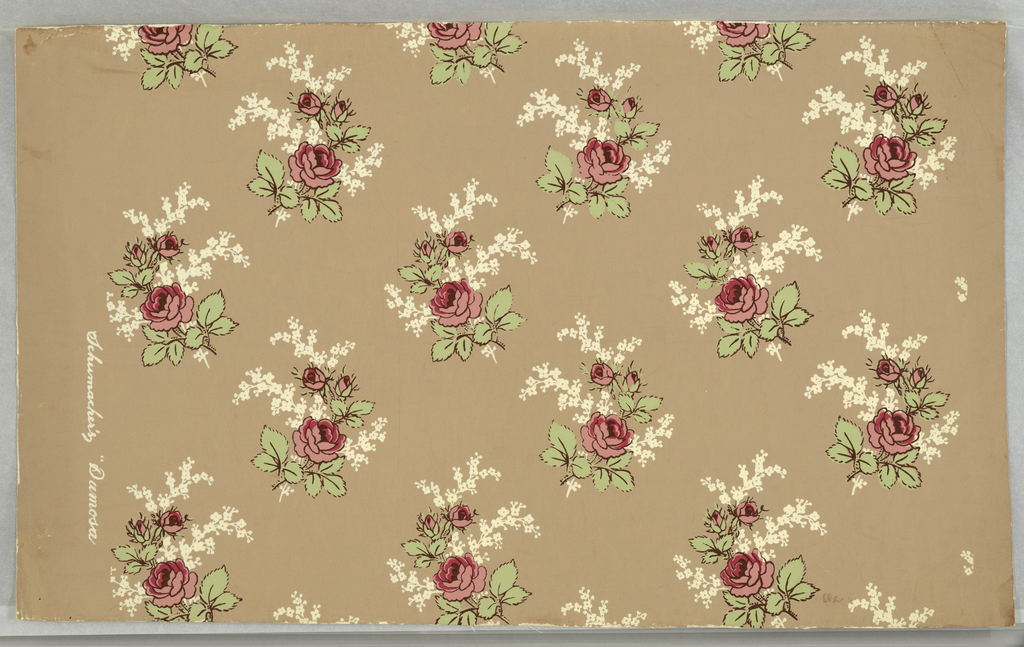 This is a Sidewall. It was manufactured by F. Schumacher & Co.. It is dated 1940 and we acquired it in 1942. Its medium is screen printed. It is a part of the Wallcoverings department.